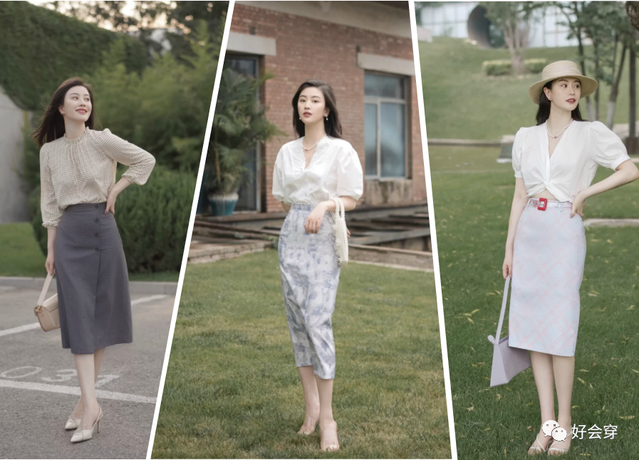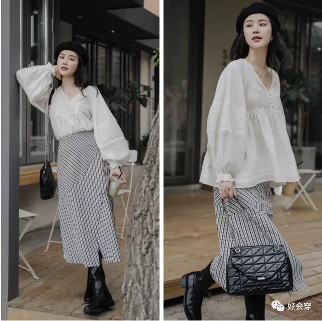 半身裙,以修身的版型最有女人味,刚刚好衬托出婀娜多姿之感。无论是格纹还是水墨花纹,文艺气质满满。搭配上也避免太抢戏,颜色上面尽量呼应,比如搭配一件具有法式古典美感的V领白衬衫,领口的设计优雅大方,版型特别温柔恬静,有淑女气质!