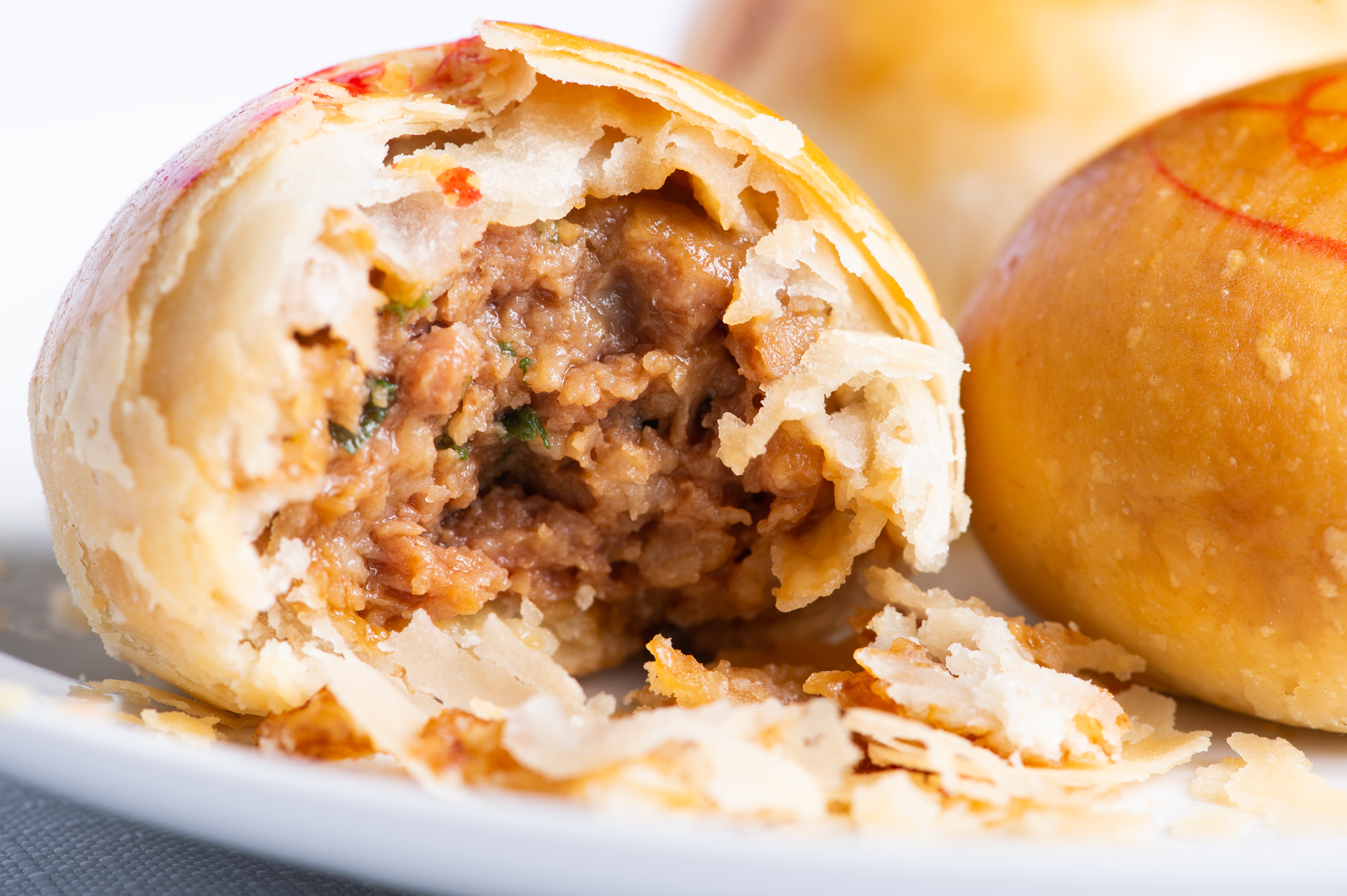 作为上海传统苏氏月饼的代表,咸蛋黄鲜肉月饼简直酥到掉渣,轻轻一碰,外面的皮就“酥酥”地掉下来;用手一掰,肉馅会爆出来,你会惊喜地发现,里面藏着一整颗“富到流油”的咸蛋黄。