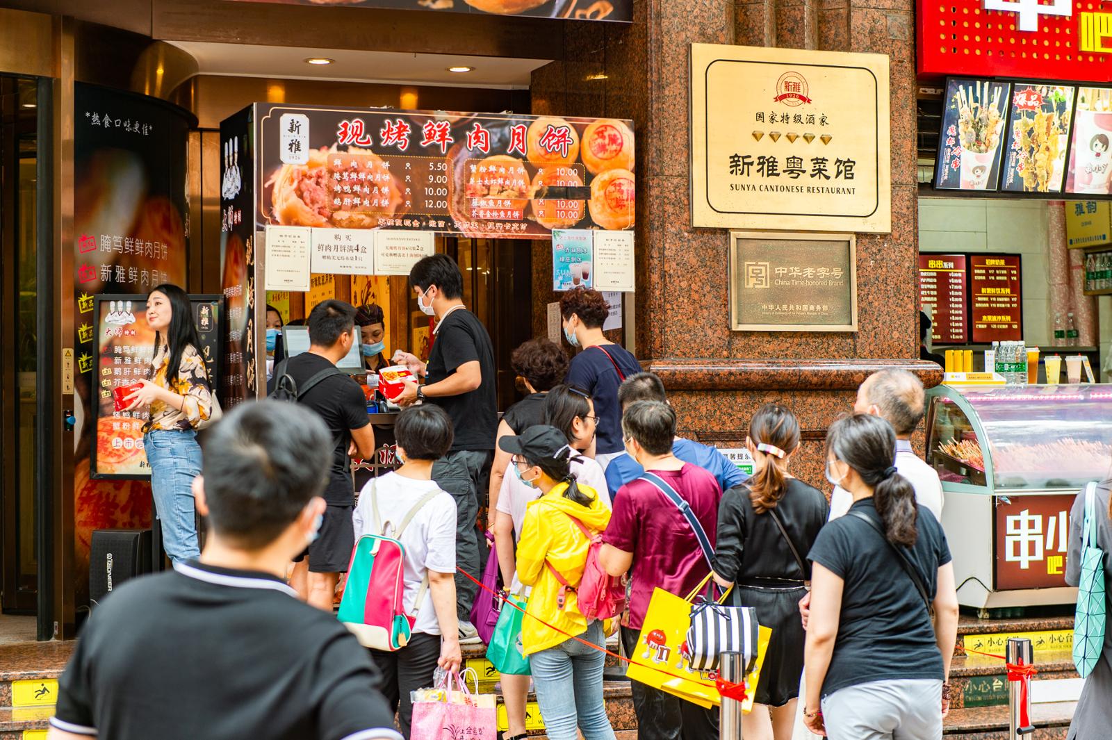 笔者最近路过南京东路的第一食品商店,就看到排队买他家黑猪肉月排的队伍已经排到了麦当劳。而它对门新雅粤菜馆的鲜肉月饼窗口前,也排了20多人的长队,有外地游客在赶飞机前,特地来这里买上四五盒现烤的鲜肉月饼带走。