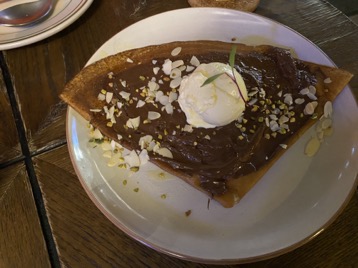 吃完咸的当然就是要来点甜的,店里必点的另外一个就是法式可丽饼,喜欢甜食的朋友一定要点冰淇淋巧克力可丽饼,底下的香蕉片搭配浓郁的巧克力酱,还有软软薄薄的饼皮和香草味的冰淇淋,一口放进嘴里,真的是大大的满足。不喜欢甜口的朋友也可以选择咸味的可丽饼,也是非常不错的。
