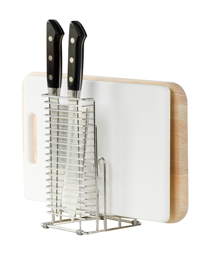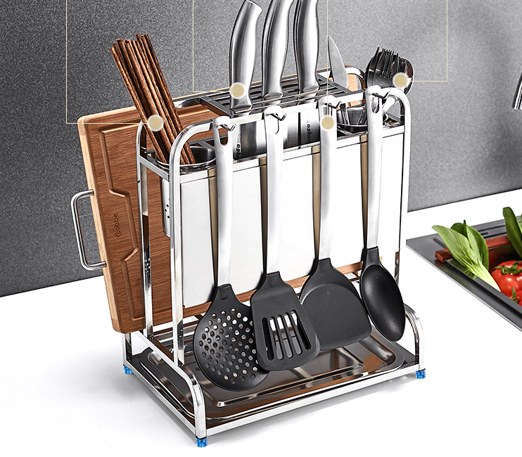 可在厨房收纳刀具、砧板、锅盖等物品。刀架的部分还可以取下来和碗碟沥水篮组合使用。不锈钢材质,承重可靠,底部带有可拆卸防滑垫,便宜实用,质感也不差。
