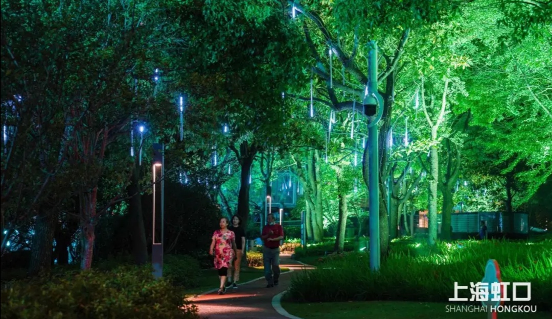 拥有一滴水、彩虹桥、音乐之门三大特色景观的北外滩滨江绿地,被称作“最美江景步道”。北外滩的夜间景观灯与江风斑驳交织下,文化长廊玻璃墙上“码头衍变”等故事,浦江沿岸的百年历史浮现脑海。