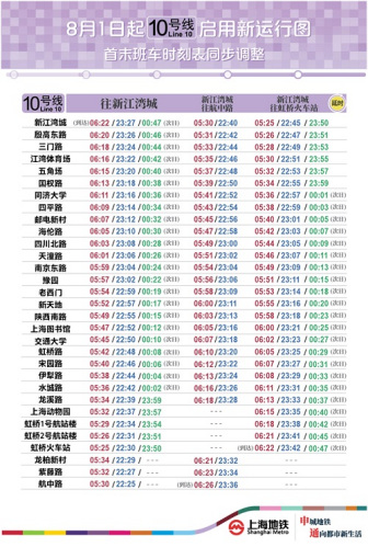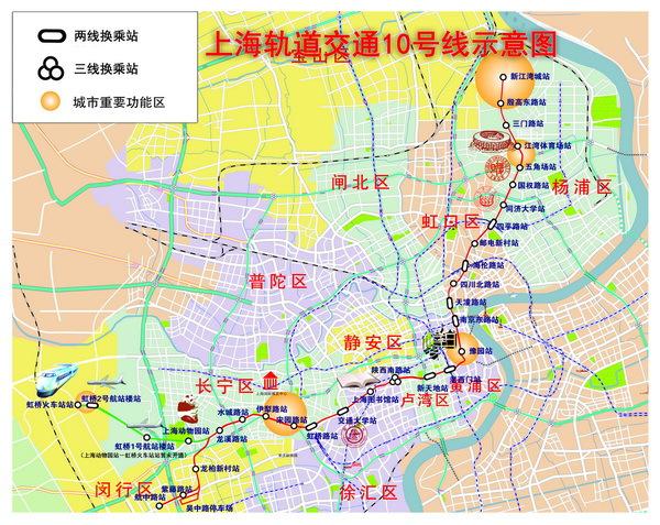上海地铁10号线2010年4月10日开通,标志色为淡紫色。主线西起闵行区虹桥火车站站,途经长宁区、徐汇区、黄浦区、静安区、虹口区,终点止于杨浦区新江湾城站,支线西起闵行区航中路站,终点止于长宁区龙溪路站,共31站。10号线连接上海市东北地区、中心城核心区、城市西南地区。