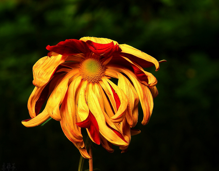 “帅旗”位列中国十大名菊之首,花瓣正面紫红色,背面金黄色,中心球状花绿黄色。