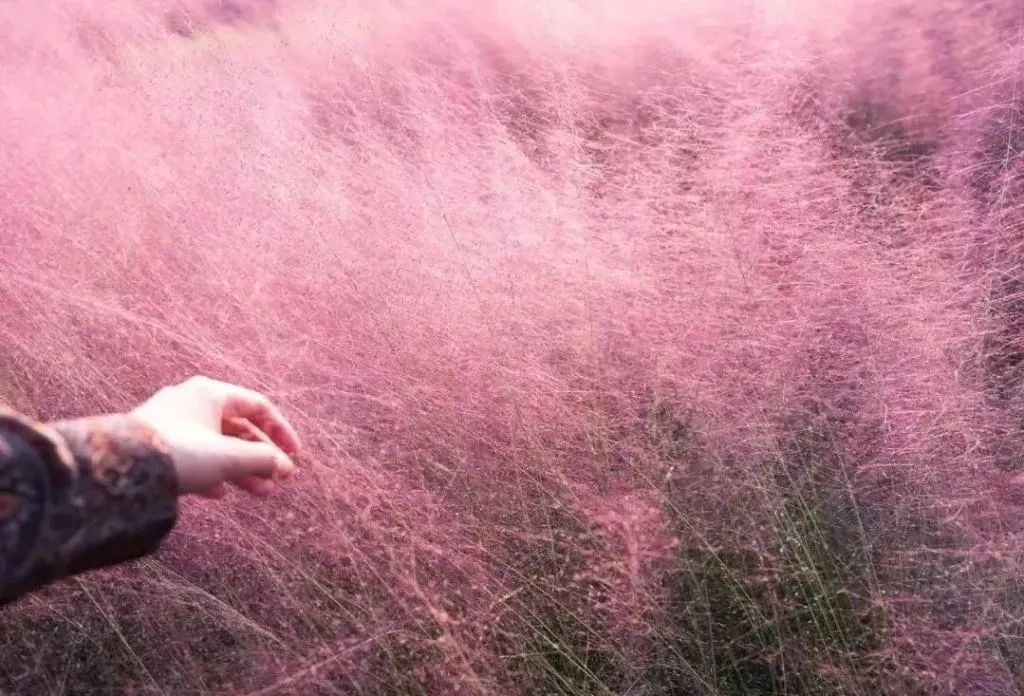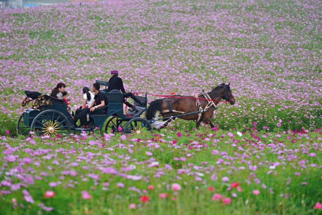 粉黛花海和粉色沙滩相互映衬,浪漫唯美。微风吹过,连片的花穗随之轻微摇摆,温柔到融化你,简直就是“少女收割机”。此外,格桑花、向日葵、醉蝶花、薰衣草也营造出热闹氛围,尽显秋日灿烂。