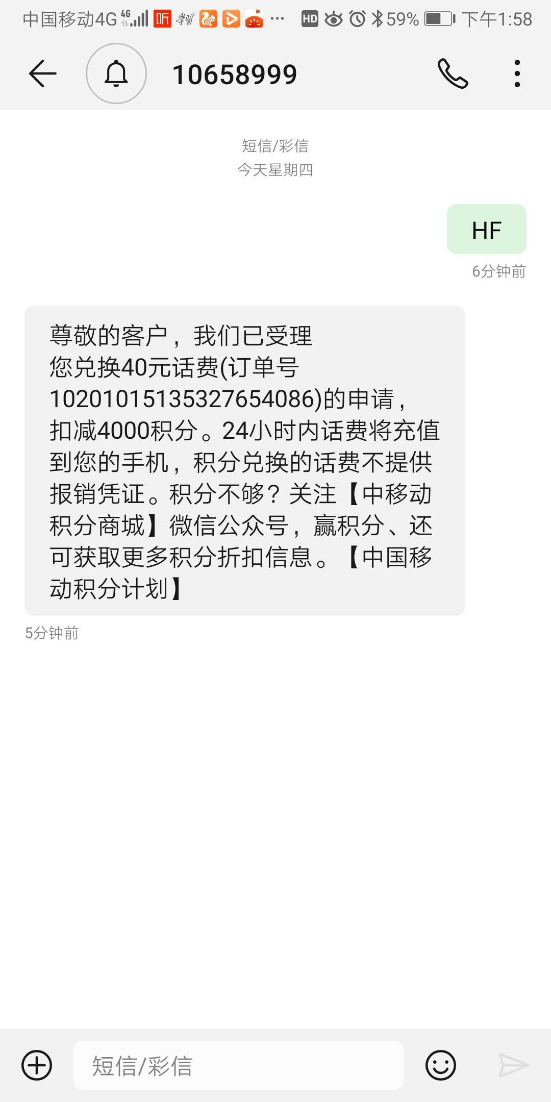 是谣传还是真相?为了验证该消息的真假,记者用137移动手机,发送短信HF到10658999这个号码,不久就收到10658999的回复短信,称:已受理您兑换40元话费的申请,扣减4000积分。24小时内话费将充值到您的手机。