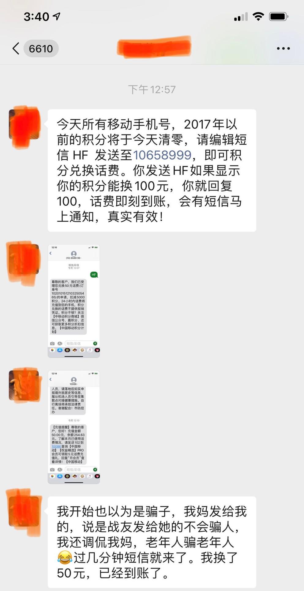采访至此,记者反而陷入迷茫:被10086证伪的短信兑换积分,现实中却是真实有效的。至于2017年前未兑换积分是否今天会清零,10086说没有收到消息,但是记者分析的结论是,赶快抓紧兑换总不会错,发送HF到10658999亲测真实有效。