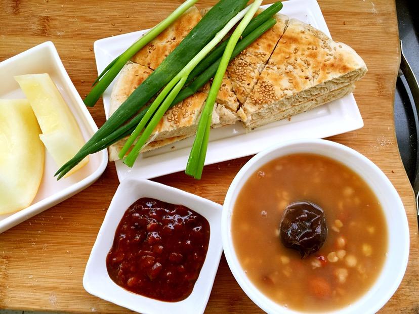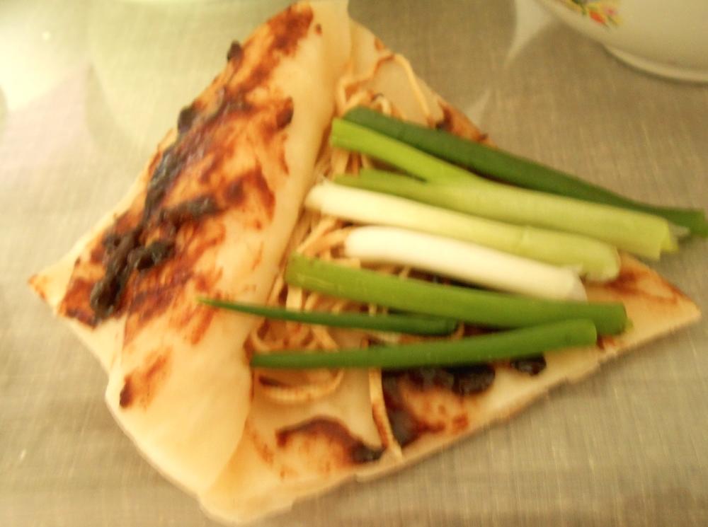 另一种是卷蔬菜。新出锅的饼,可以卷各种肉类、蔬菜、炒蛋,再佐以酱料。不过笔者喜欢更豪爽一点的吃法,大饼卷甜酱和小葱。南方的朋友们都听过、吃过浙菜系的传统名点“葱包烩”吧?在笔者眼里,香葱蘸酱卷饼,这味道只会有过之而无不及。