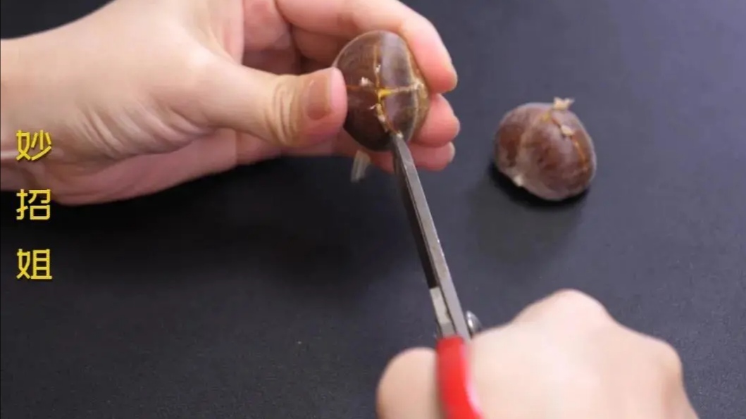 晾晒好后,用剪刀把栗子划开一个口子,或用菜刀砍一下。用菜刀砍的时候,建议在栗子下面放一个塑料瓶盖,防止栗子“乱跑”。