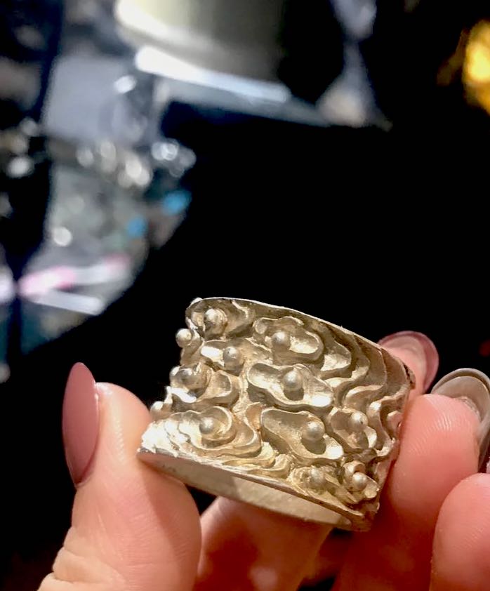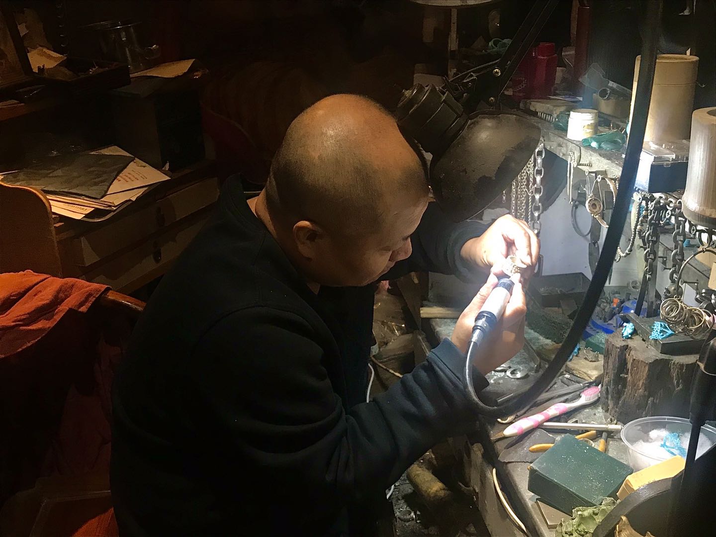 见到店主厍永平,他正在雕琢客户定制的一枚六字箴言吉祥云纹纯银嵌金戒指。
