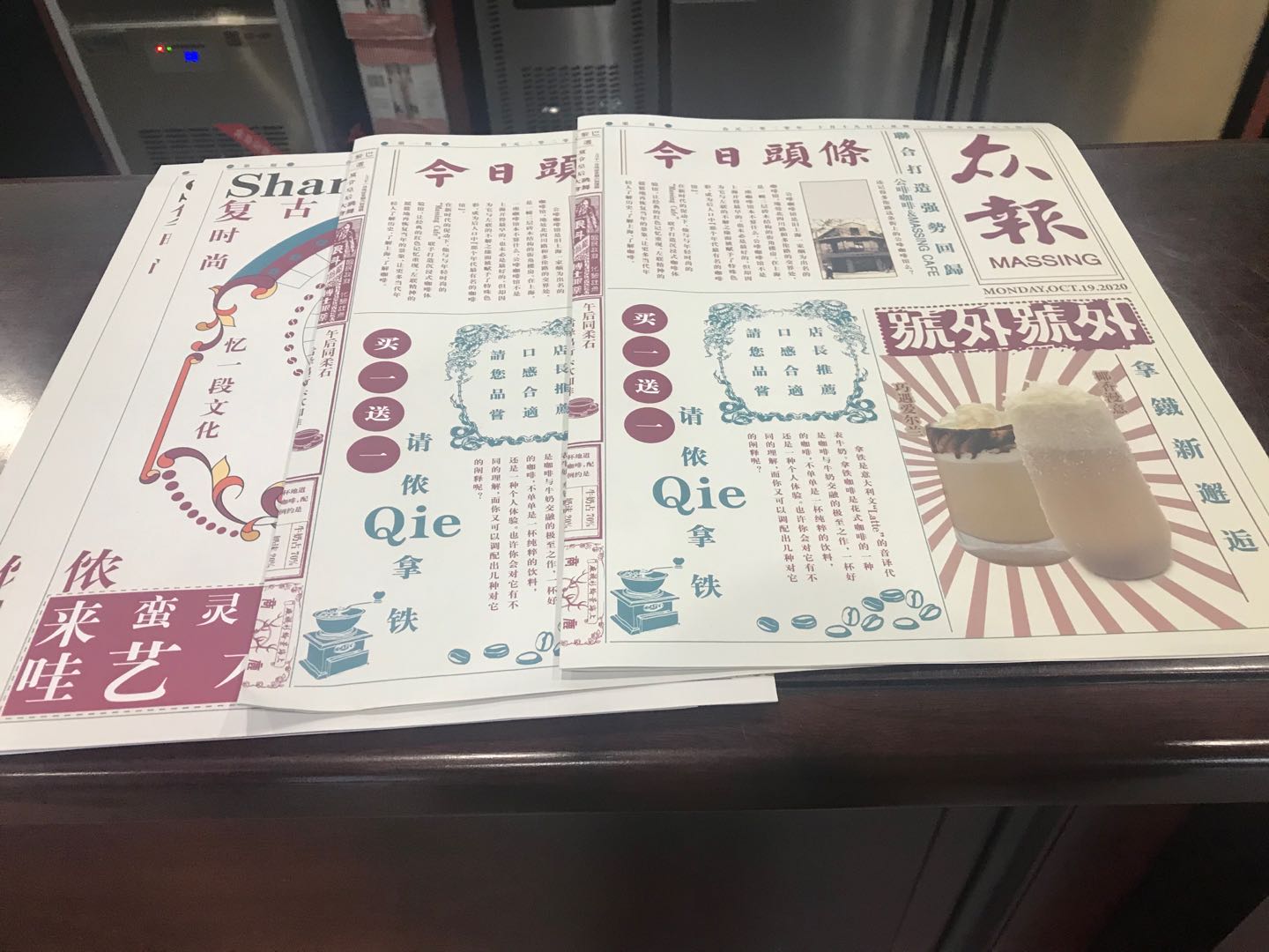 咖啡行业从业15年的店长邵先生热情介绍,从咖啡豆选择到制作工艺,都一心想打造精品咖啡的感觉。尤其,小时候看着父辈们喝上海咖啡、清咖,至今仍有一种情怀在,就想着探索还原老上海的咖啡味道。另外,点单的册页也很有设计感,一种陈年老报纸的风格,而且印着地道的上海话,俏皮有趣。在一栏里,特意标注着,给先生的一杯茶。