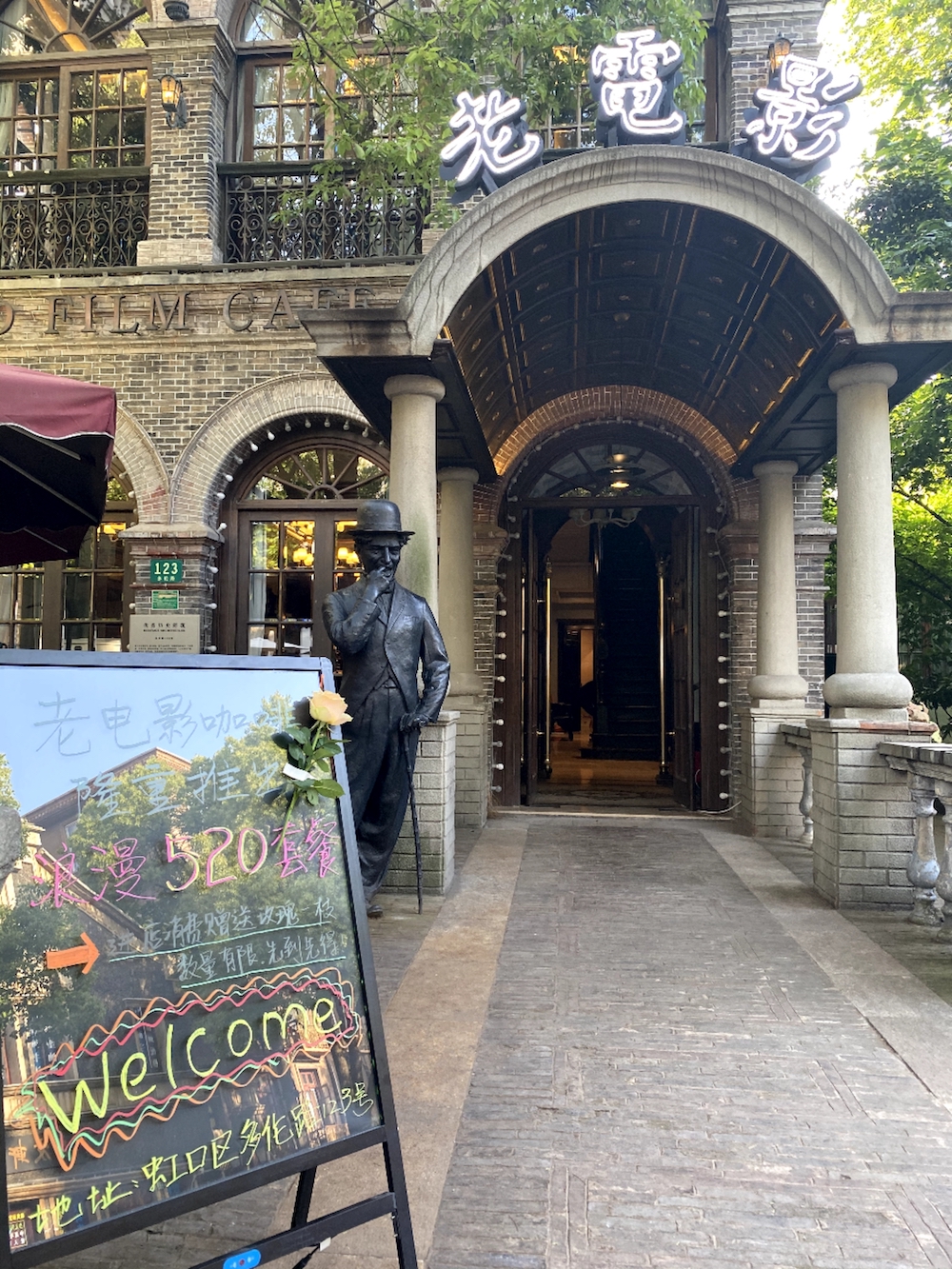多伦路123号的老电影咖啡馆,是非常有名的老字号。西式建筑风格的三层小洋房,拱形的门檐,复古又洋气。上世纪最杰出的老电影代表人物的雕像——卓别林,绅士地站在门口打着招呼。