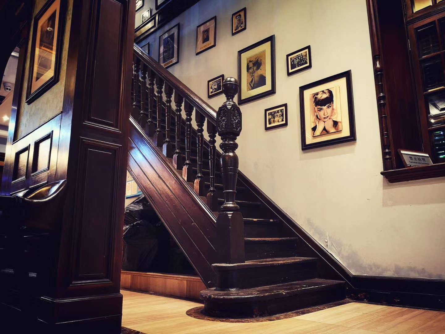 踏着吱吱作响的楼梯,从窄窄楼梯爬上二楼,墙上悬挂着很多老电影明星的老照片,高大的木质大橱柜,存放很多经典名著。