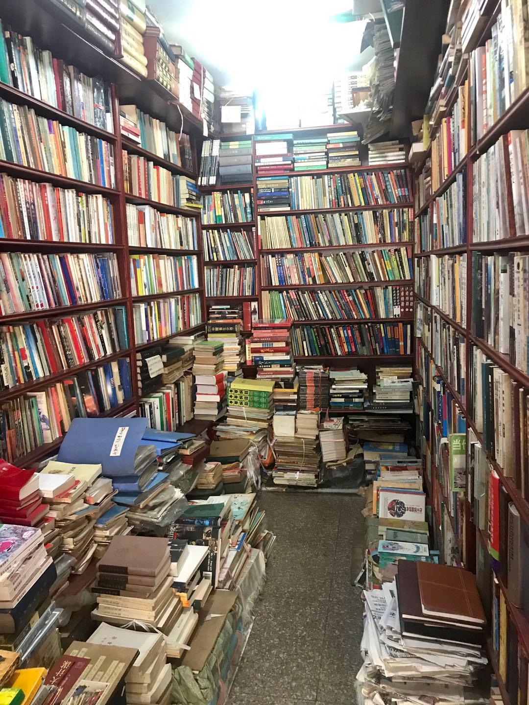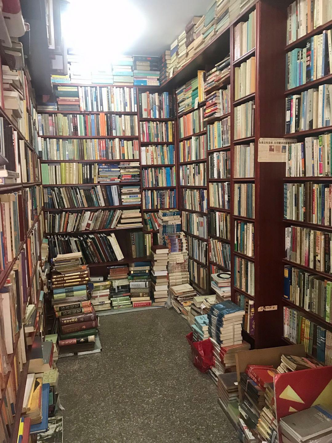 “寻寻觅觅几十回,不如到此访一家”。置身10多平方米的逼仄空间内,甚至没有转身回旋之地。高耸拥挤的书架,从天到地密密匝匝地布满了旧书,知识密度之大让人惊讶。