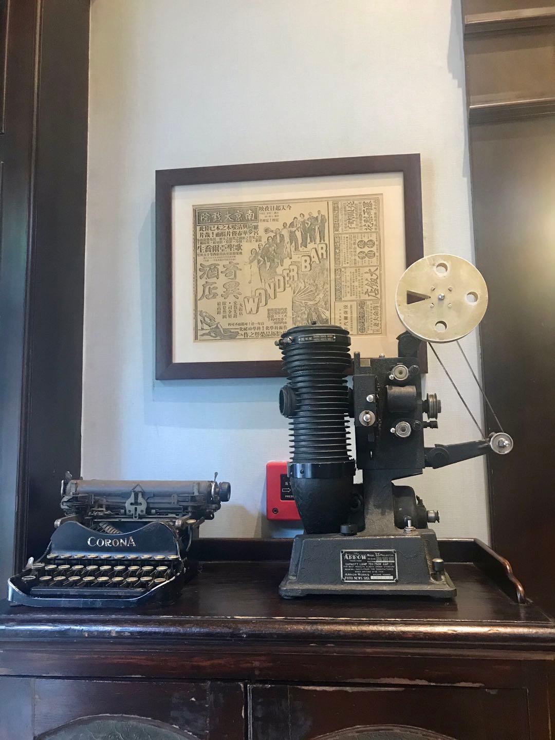 拱形橱窗,昏暗灯光,旧木地板,上世纪的放映机、留声机,古旧气息的桌椅、吊灯,仿佛置身电影里的场景。