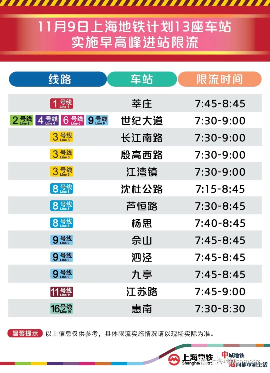 今天,上海地铁早高峰限流措施继续,将有13座地铁站早高峰计划限流。