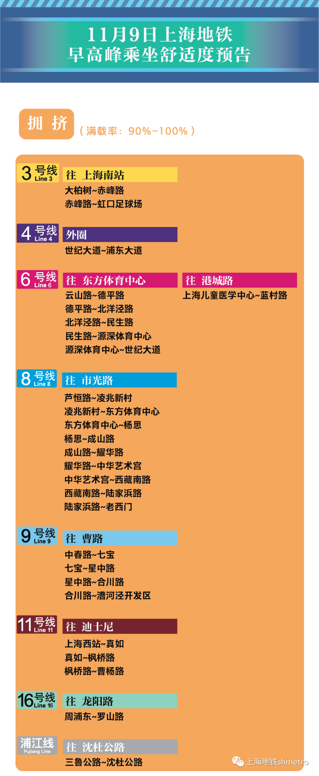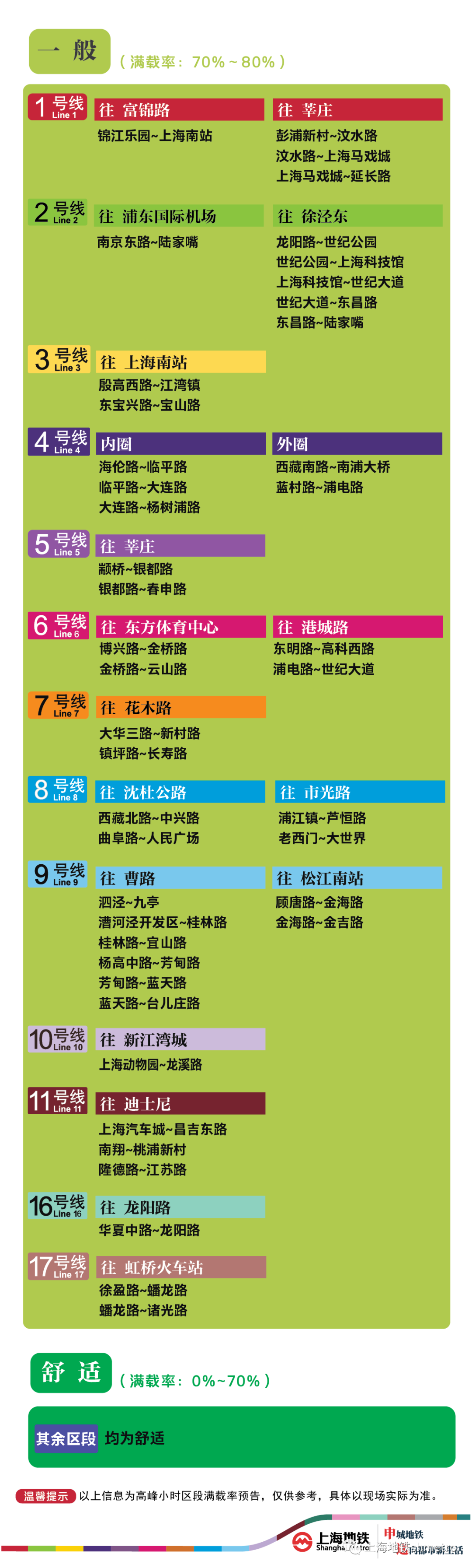 为提升上海地铁早高峰期间出行服务水平,提升乘客乘坐体验,上海地铁向乘客提供乘坐舒适度预告,方便乘客提前做好出行准备。