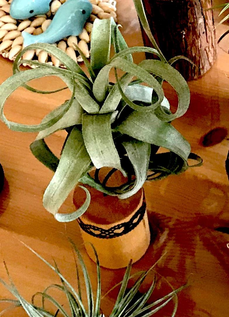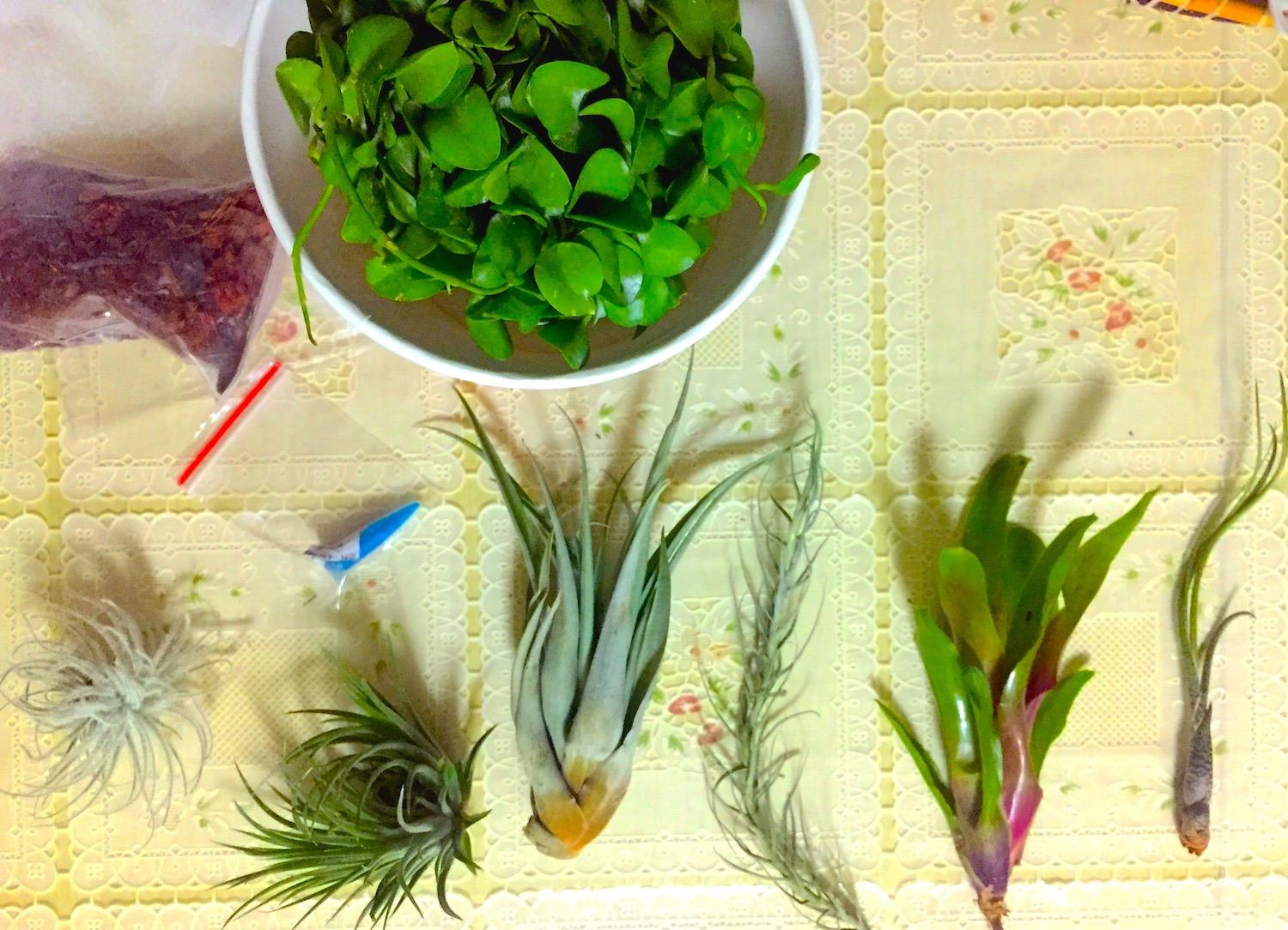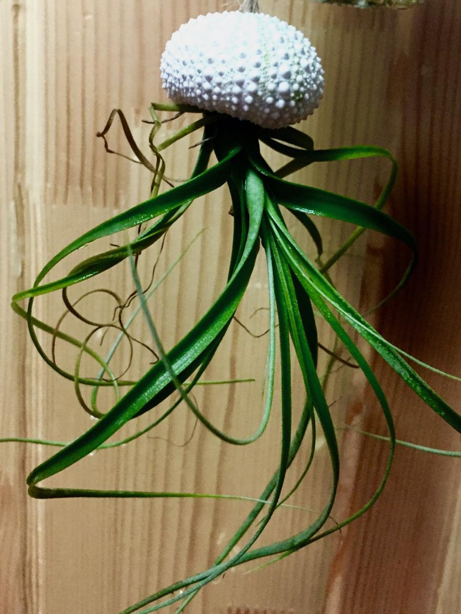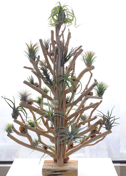 为了将这些天赋异禀、颜值各异的空风们布置出美感,笔者可是花了不少心思。因为空气凤梨的根系不是用来运输养分的,在野外只是起到附生固定作用,所以定植时需要容器固定。任何可以拿来提升颜值的器皿,我基本都会收集,贝壳、珊瑚、石头、树桩、绳索、铁丝等等,都派上了各自的用场。