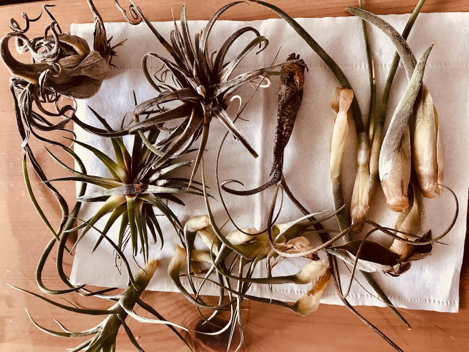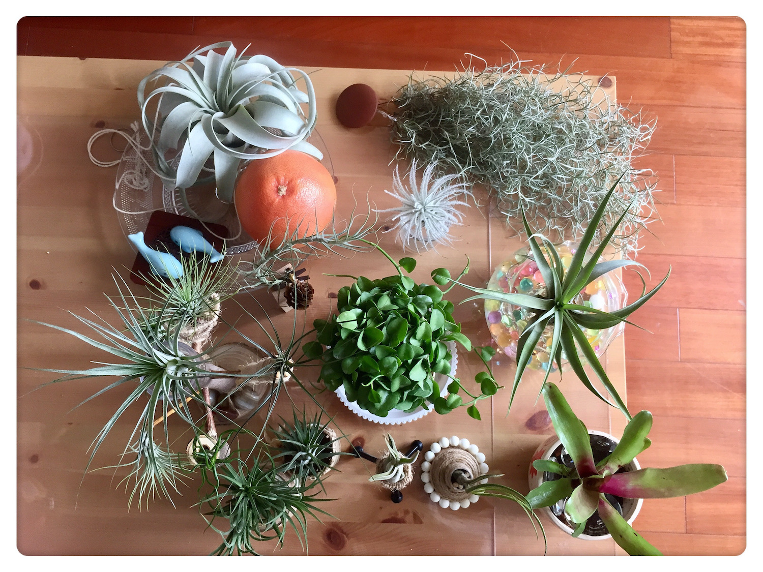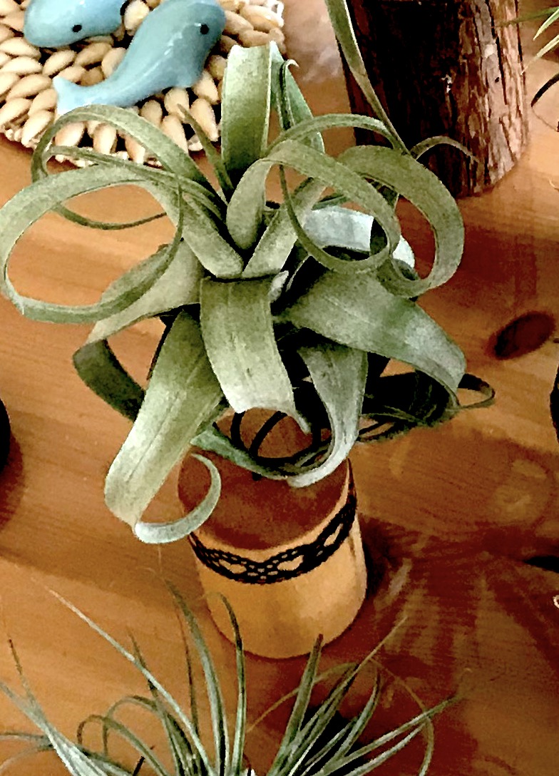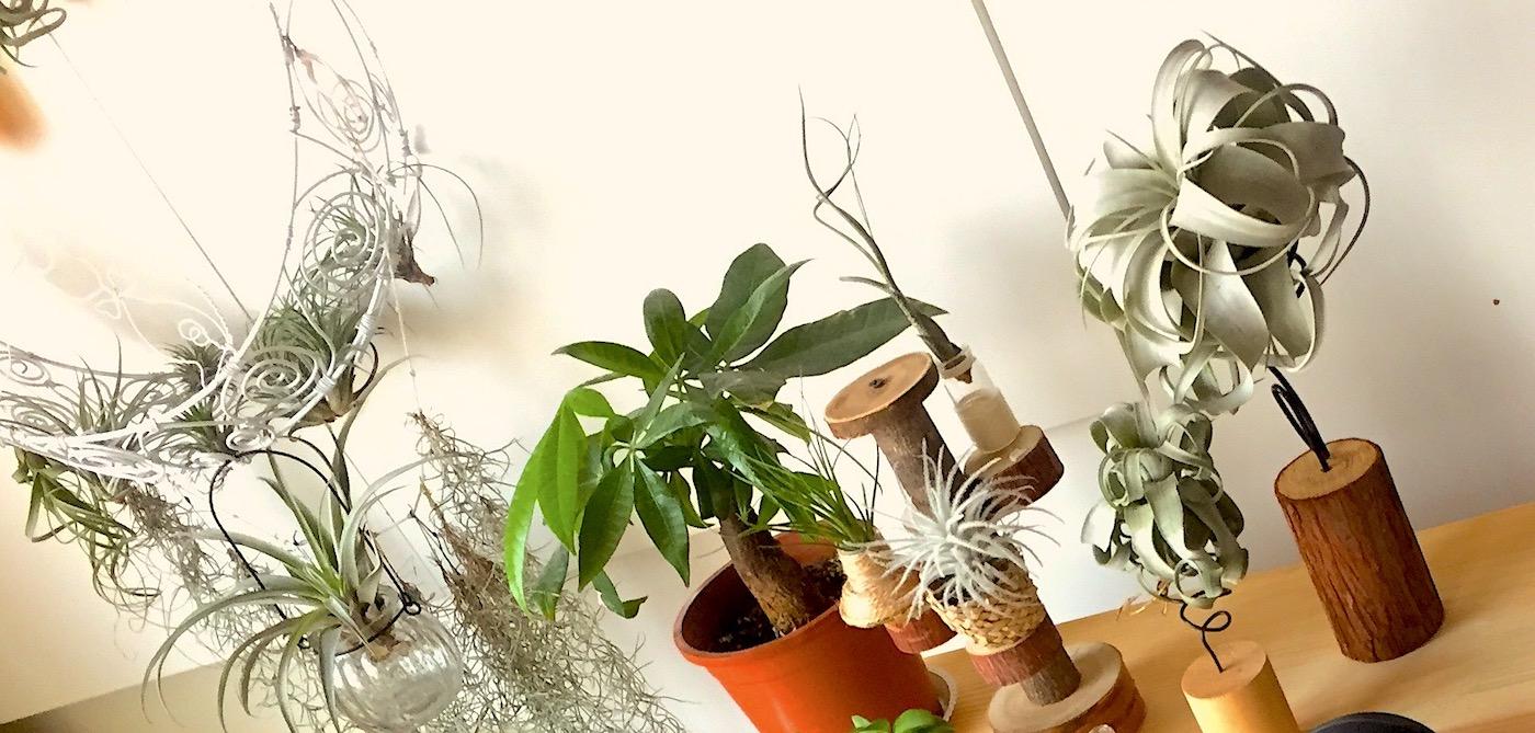为了将这些天赋异禀、颜值各异的空风们布置出美感,笔者可是花了不少心思。因为空气凤梨的根系不是用来运输养分的,在野外只是起到附生固定作用,所以定植时需要容器固定。任何可以拿来提升颜值的器皿,我基本都会收集,贝壳、珊瑚、石头、树桩、绳索、铁丝等等,都派上了各自的用场。