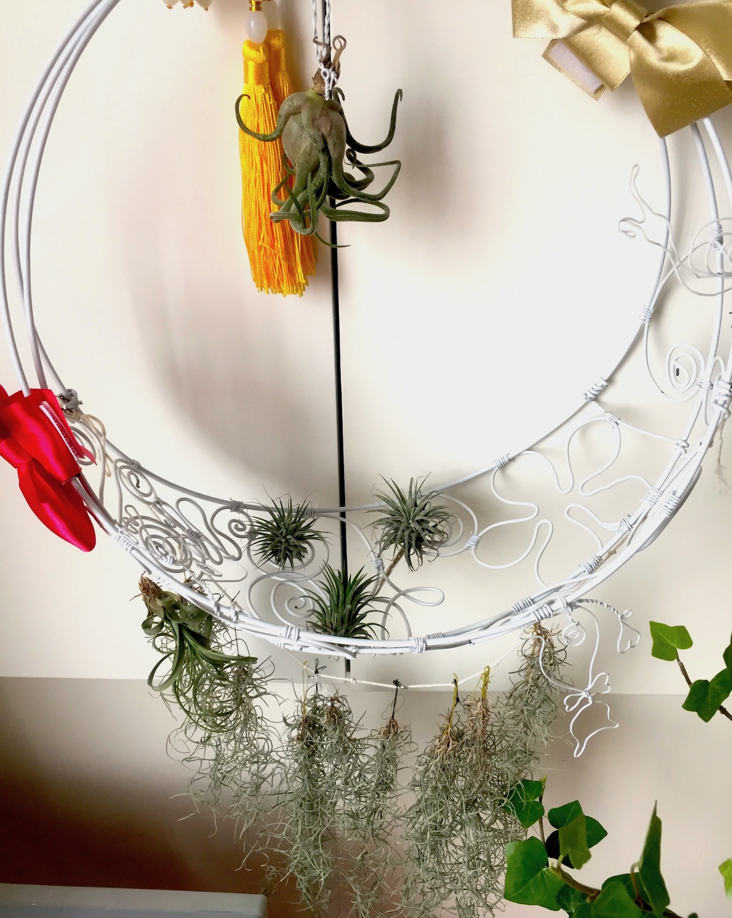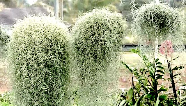 拥有了这些,如果还想要一点气氛,那么一挂挂的松萝凤梨(老人须、空气草)绝对是最佳点缀。它的叶子特别茂密,银白色、低饱和度的叶子低调美观,悬挂下垂像小瀑布一样。
