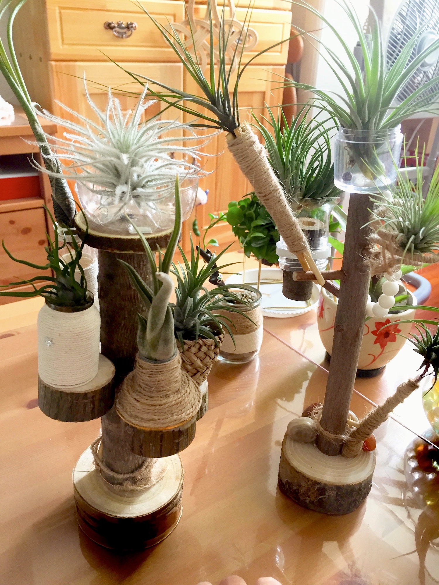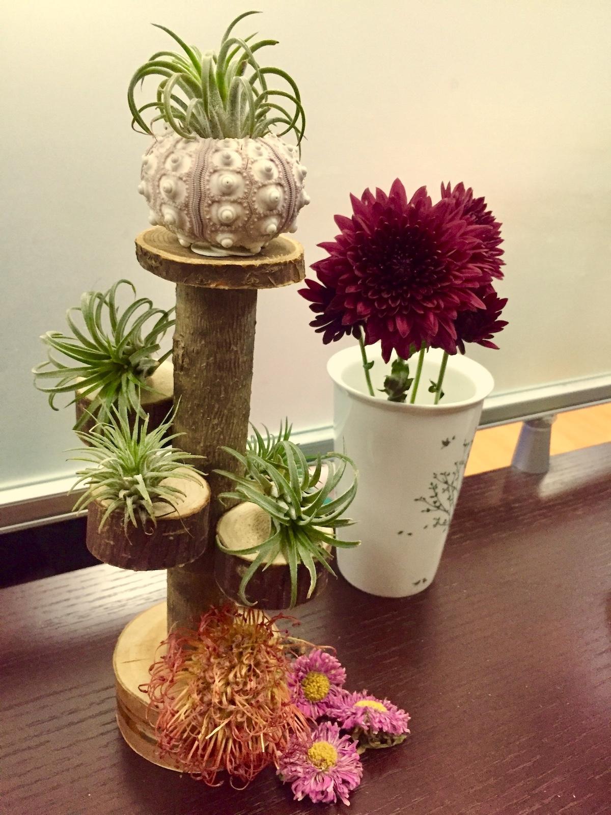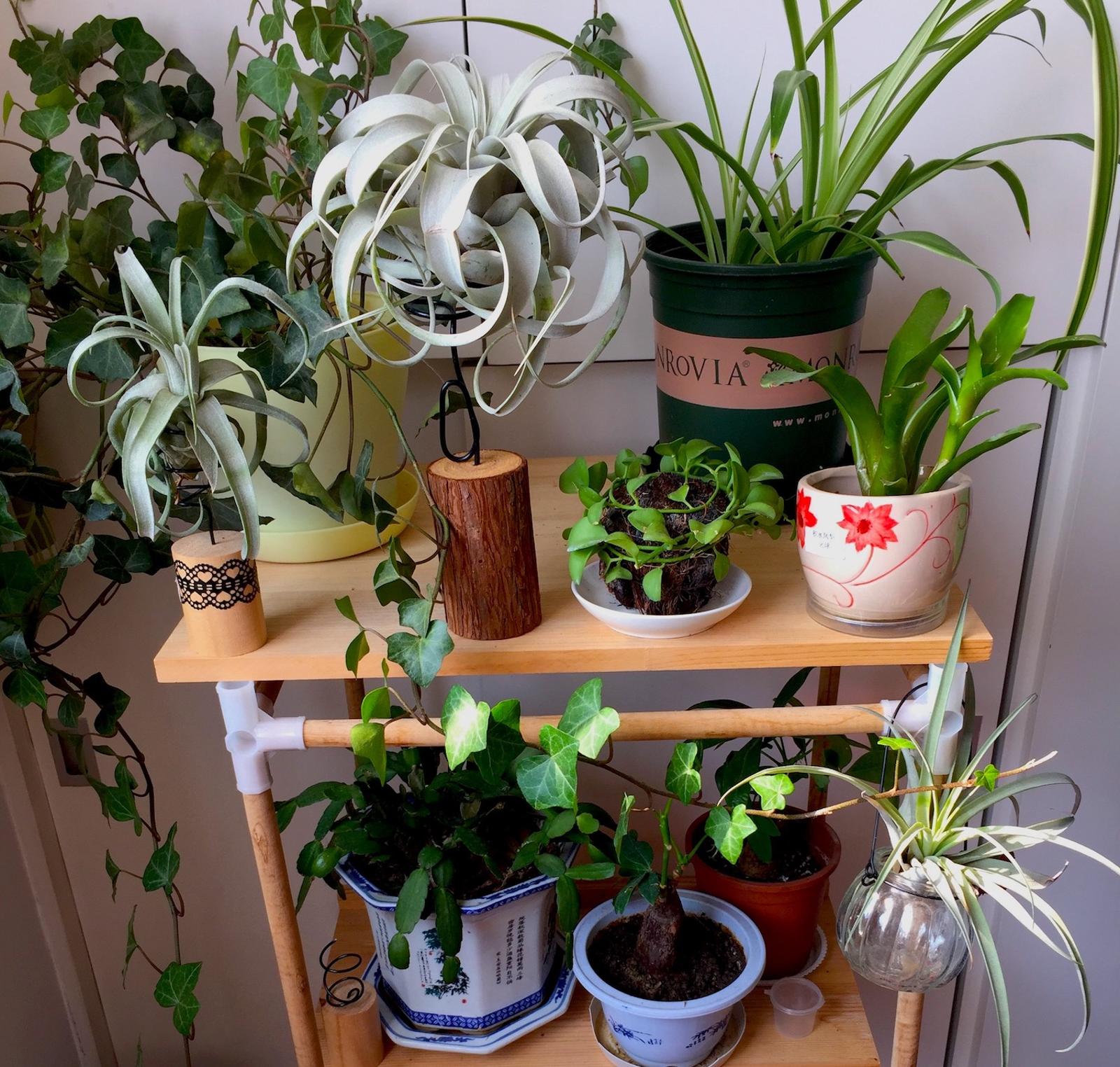 为了帮空风们安家,笔者甚至做起了木匠。网购了木桩和木片、双头尖的铁钉和锤头,叮叮咣咣造出一个高低错落的木头展示架。