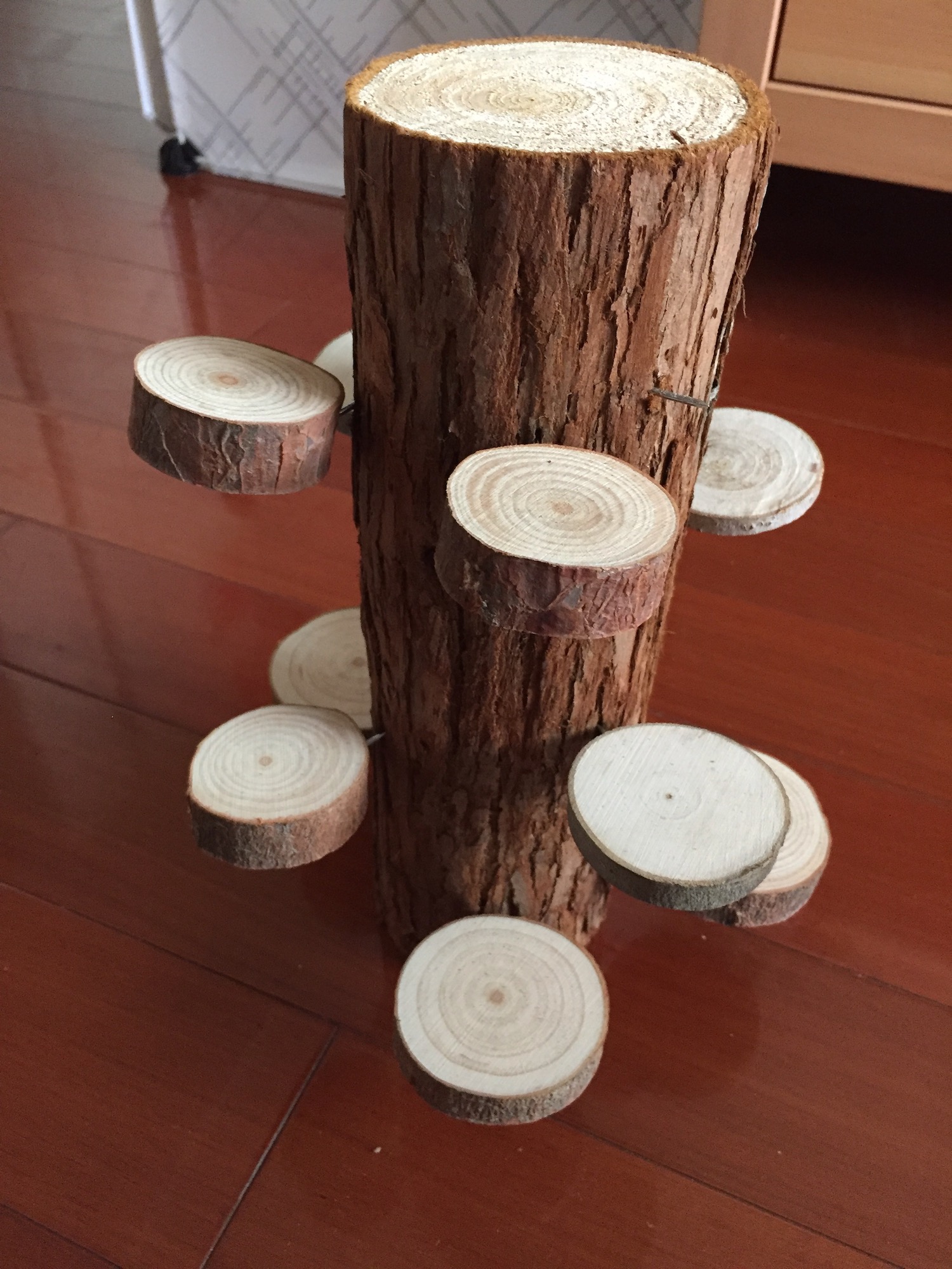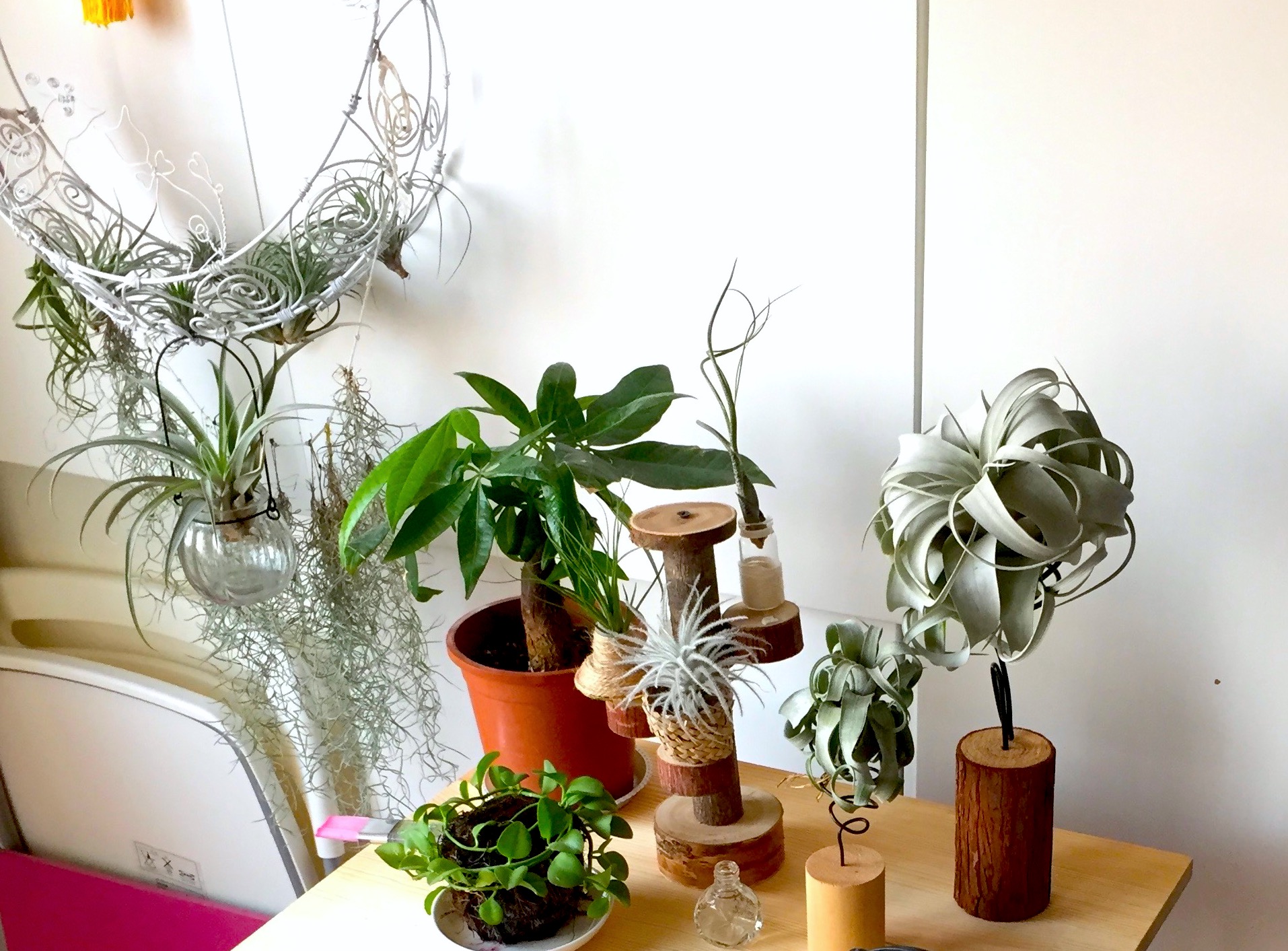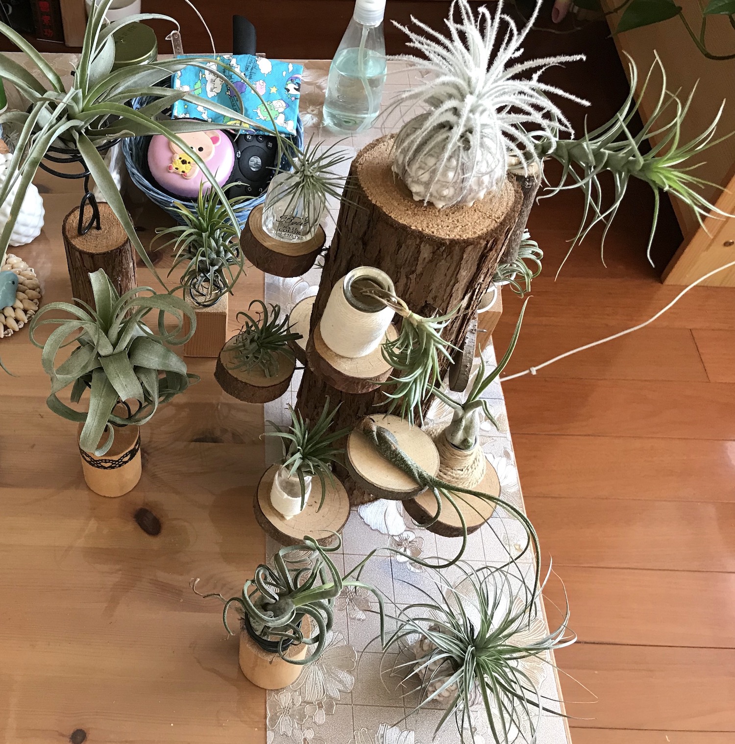为了帮空风们安家,笔者甚至做起了木匠。网购了木桩和木片、双头尖的铁钉和锤头,叮叮咣咣造出一个高低错落的木头展示架。