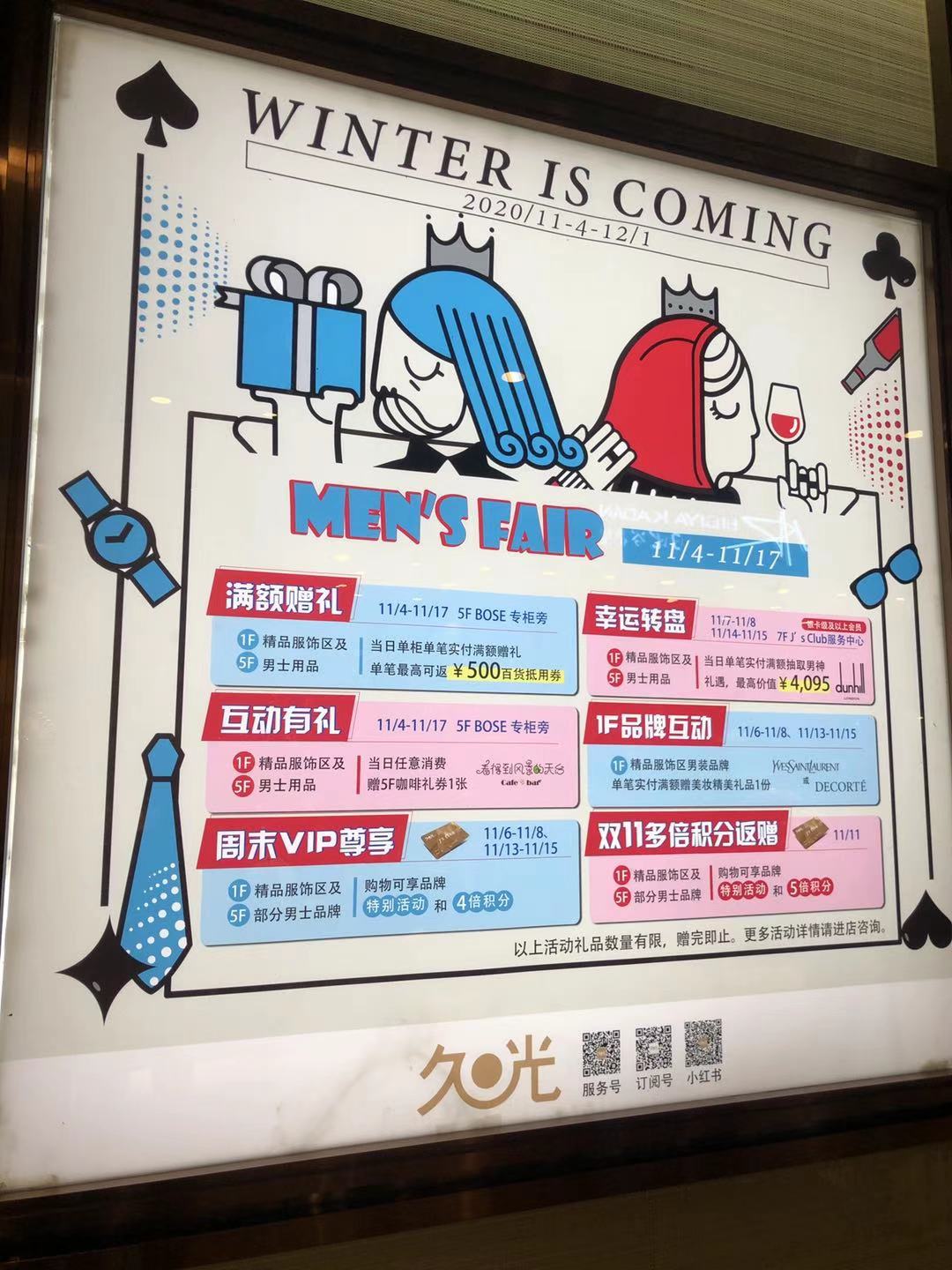 LADIES’ FAIR!在大多数人概念里,双十一买买买女性才是主力军,然而,在男士也会化妆敷面膜的当下,怎能忽略了“他”的购买力,久光百货便反其道而行,把双十一主场留给了男士,11.4-11.17,MEN’S FAIR,男士品牌4折起,最高单笔可返500元抵用券,还可参与抽奖,返赠多倍积分。笔者在男装柜台就看到了不少前来买买买的品质男士,也有很多为父亲、爱人买东西的女性。