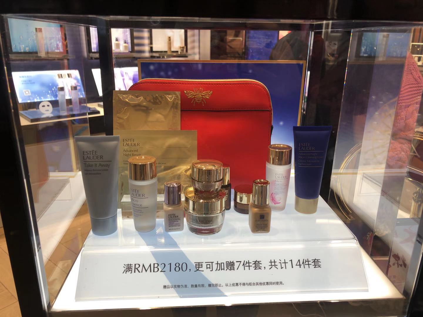 在南京路步行街的第一百货商场内,雅诗兰黛柜台人头攒动,买满2180即送14件超值小样的活动吸引了不少消费者,同时,会员一次性购化妆品类商品每满1200元还可获得400元现金券。