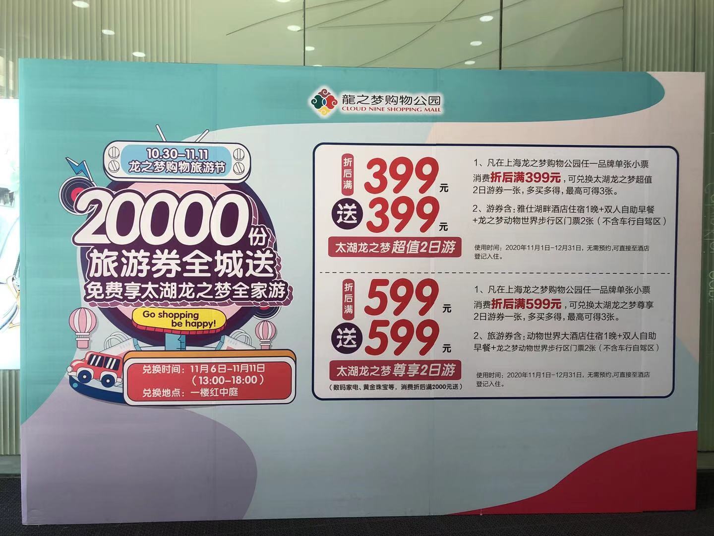 据悉,今年双十一,除各品牌都会推出大力度折扣外,商场还将推出“旅游券全城送”的活动,折后消费满399即可兑换“太湖龙之梦2日游”券一张,最多可得3张。