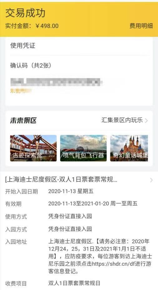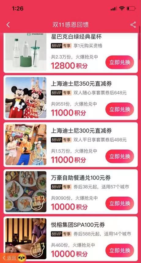 1、迪斯尼套票权益兑换:门槛——购物满7000元+88会员,花费11000积分,双人平日票498元,周末票648元,兑换有效期至2020年11月20日,使用有效期到2021年1月20日。注意,一些节日不能使用。