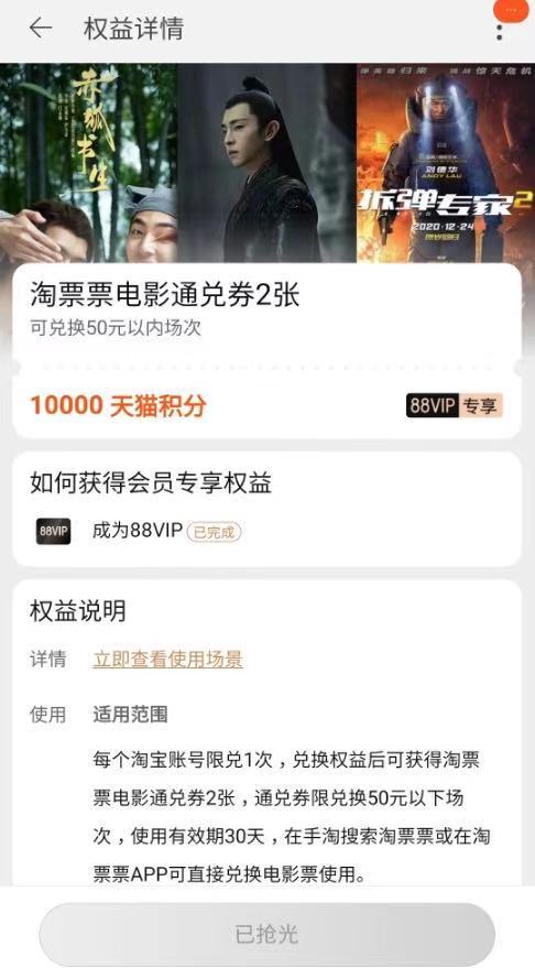 2、淘票票,10000分换2张淘票票上的电影票,注意:只能兑换50元以内场次,限1个月内使用。