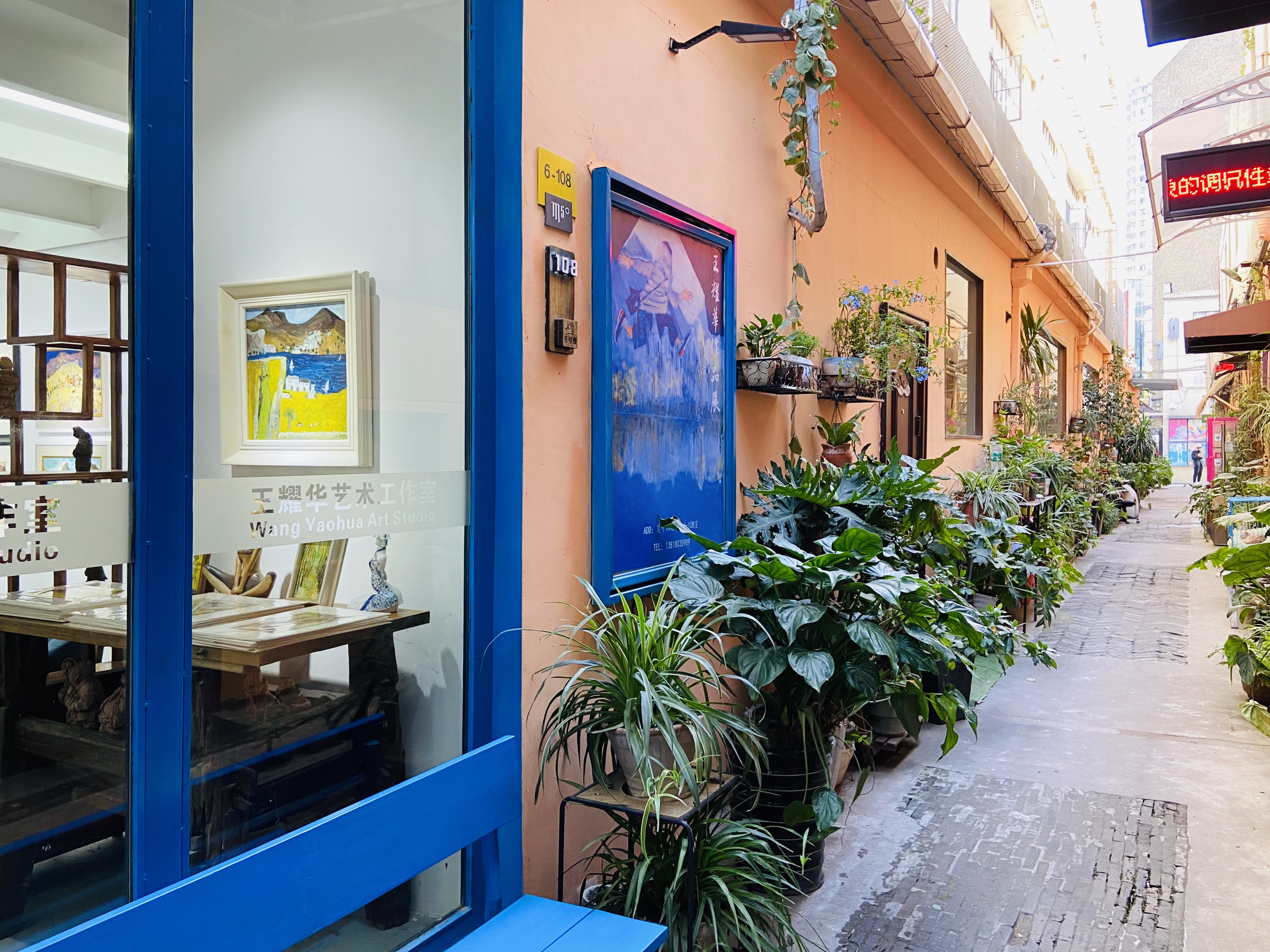 走进园区,左手边有个弄堂,里面是一家家的画廊和工作室。让笔者印象深刻的是,工作室外面摆满花草,淡粉色的墙壁上挂着艺术家的作品,一眼望去,还以为来到了哪个童话小镇。
