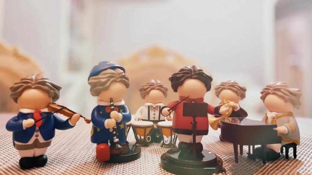 圆圆的脸蛋、胖嘟嘟的身材、一头标志性的中分卷发……6个以贝多芬为原型的玩偶,正在分别弹奏钢琴、小提琴、单簧管等,它们放置于3D打印技术复刻的上海音乐厅舞台模型中央,Q萌的造型令人忍俊不禁。这套贝多芬盲盒,包含六款贝多芬造型的人偶玩具,玩偶包装盒背景则还原了上海音乐厅内部的演奏厅。在上海音乐厅现场,“贝多芬”成了很多人的“萌宠”。来音乐厅听音乐会的人,不少在音乐会结束后直奔售卖处买盲盒,并迫不及待地“开箱”、拍照、发朋友圈。