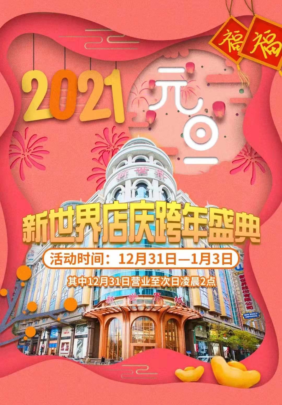 12月31日,商场还准备了“跨年厚礼”献礼新年,你消费,我免单。100名免单、100根金条、500张三百元交通卡,是新世界献给广大消费者的新年礼物。当天新世界的营业时间将延长至次日凌晨2点。凌晨许,新世界还将为光临新世界的顾客奉上总计2021份的新年第一份夜点心,让这个冬天充满暖意。