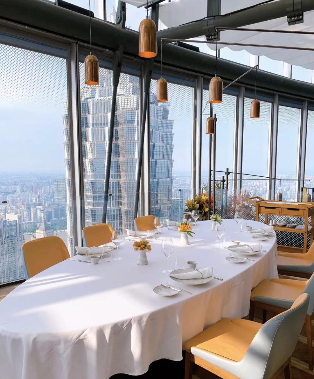 lameloise坐落于上海中心68楼,一楼有专用电梯直达,可以说是云端上的体验。整体布局很好,非常静谧安逸。每一个位置都是景观位置,可以将外滩景色尽收眼底。旁边触手可及的金茂大厦和东方明珠是最大的亮点。