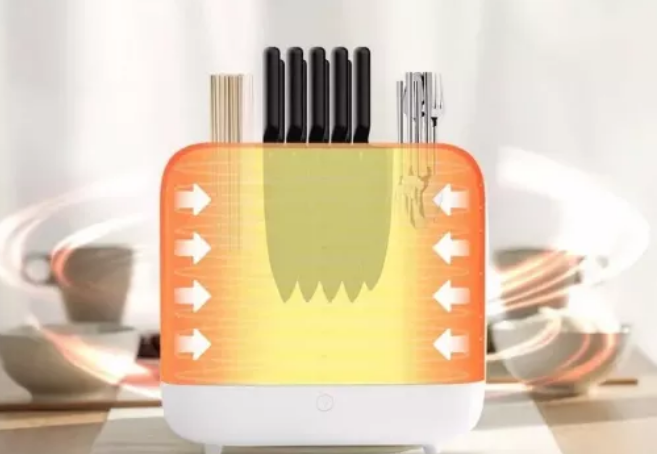 某实验室做过一个研究,不良的收纳方式会导致筷子、刀以及砧板上的大肠杆菌、黄曲霉素和金黄色葡萄球菌含量超标,影响我们的健康。智能刀筷架可以杀菌、烘干、收纳,是多种功能为一体的厨房小神器。