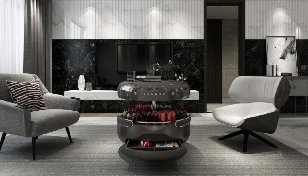 这款茶几集音箱、充电器、调灯台和冰箱功能于一体。茶几左右两侧是蓝牙扬声器;右侧配有两个USB插座和两个110V插座;桌底设有LED照明,可根据情况调整灯光颜色;这个茶几最吸引人的特色是,内含一个压缩机迷你冰箱,可放置60瓶酒水饮料;迷你冰箱下侧还有一个抽屉,可以存放杂志书籍、遥控器等杂物。