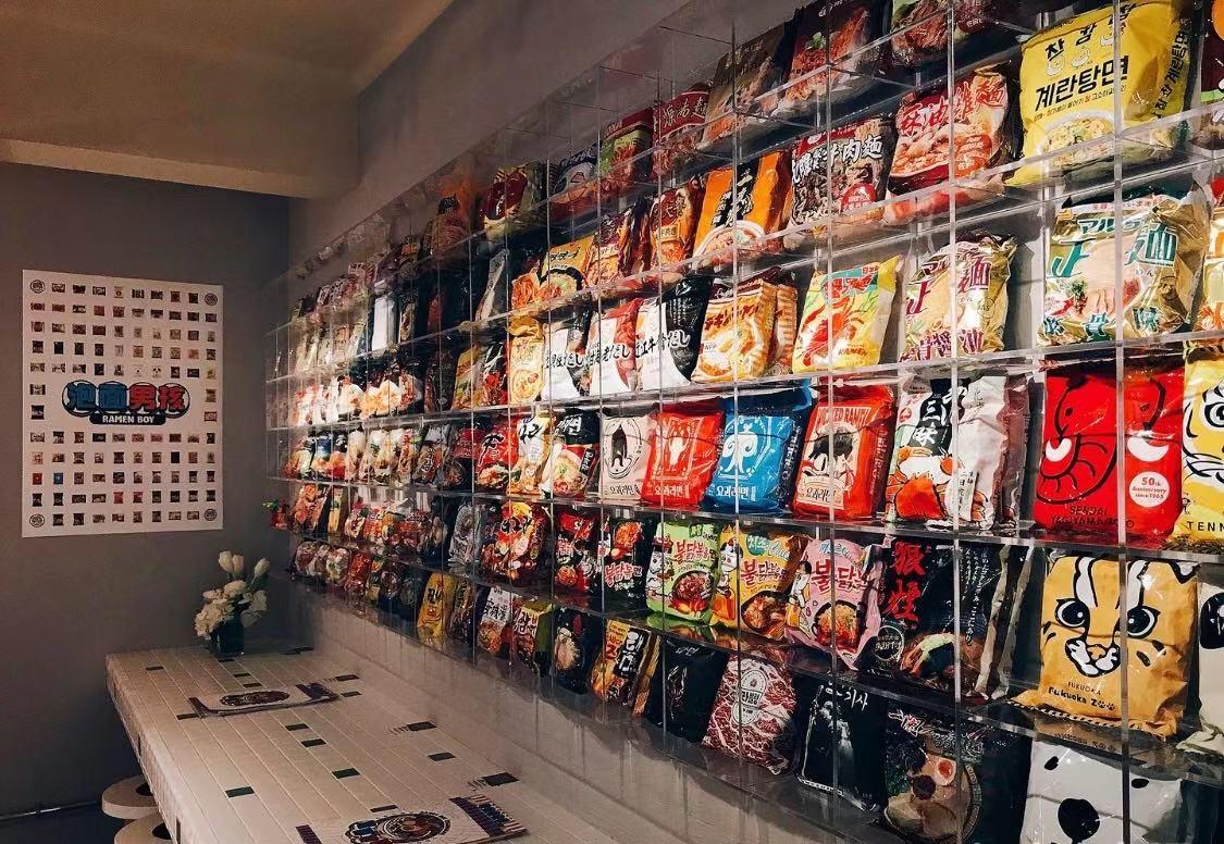 小店藏在一个不起眼的小区里,店长是台湾人,店面装修非常小清新。店里有一整面的泡面墙,汇聚了100种来自各地泡面,对于我这种泡面控来说太治愈了,恨不得都打包回家。