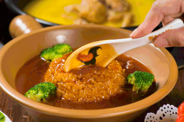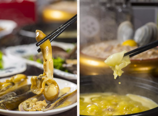 养颜花胶鸡汤底是这里的招牌,是养生党的滋补利器。肥美的六头鲍、竹蛏王、象拔蚌在养颜花胶鸡汤锅里转个圈圈,一筷子上来感觉自己的味蕾瞬间绽放。鲍汁捞饭也超好吃,一口下去,直呼满足。