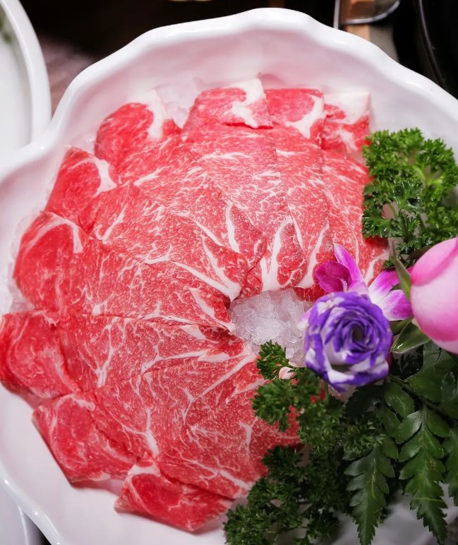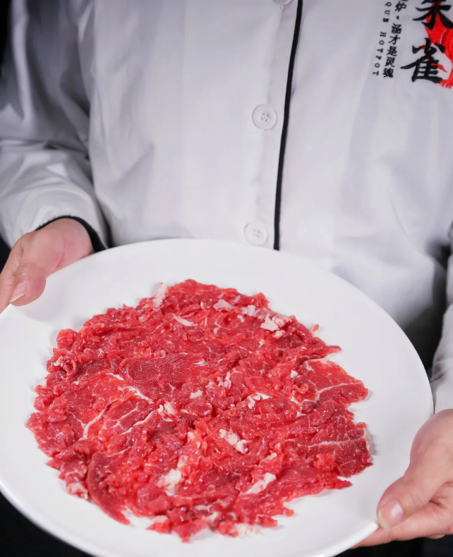 朱雀的现切鲜牛肉来自云南的高原,完全纯天然放养,满满一盘的鲜牛展厚薄均匀、色泽鲜亮,非常太诱人!高质量的澳洲和牛脂肪分布均匀,有类似霜降的大理石纹路,口感更加嫩滑。在涮煮的过程中油脂流出,口感鲜甜,享受美味在舌尖跳动!