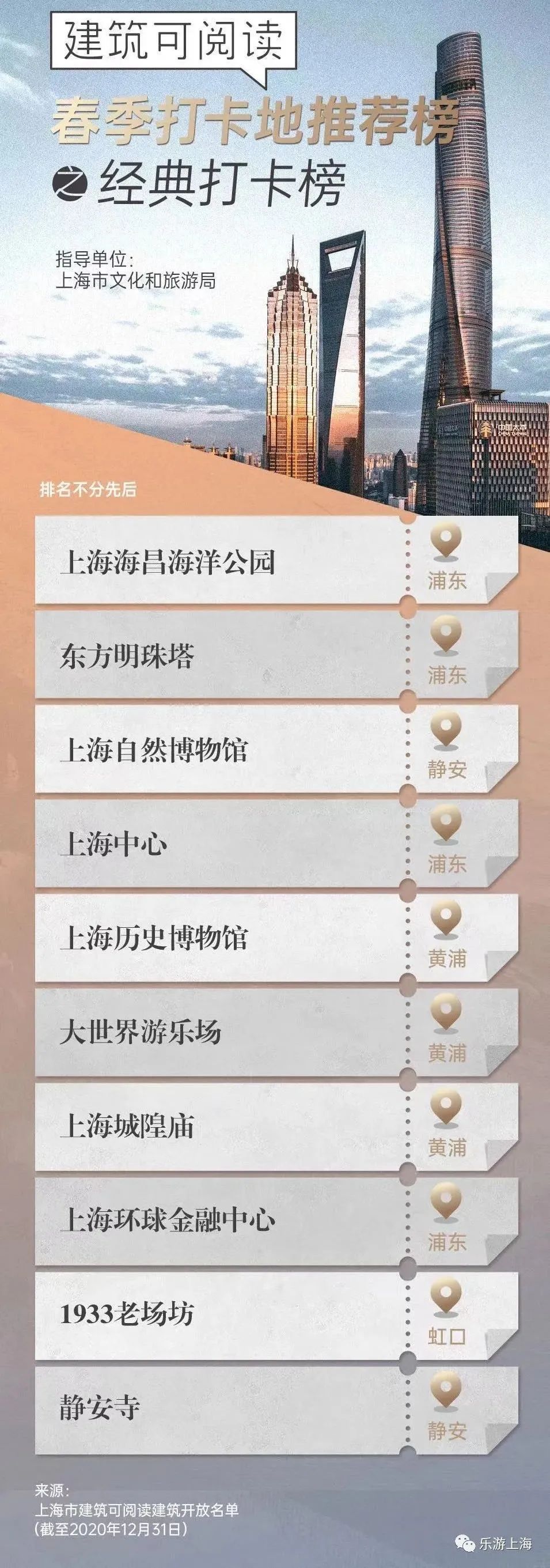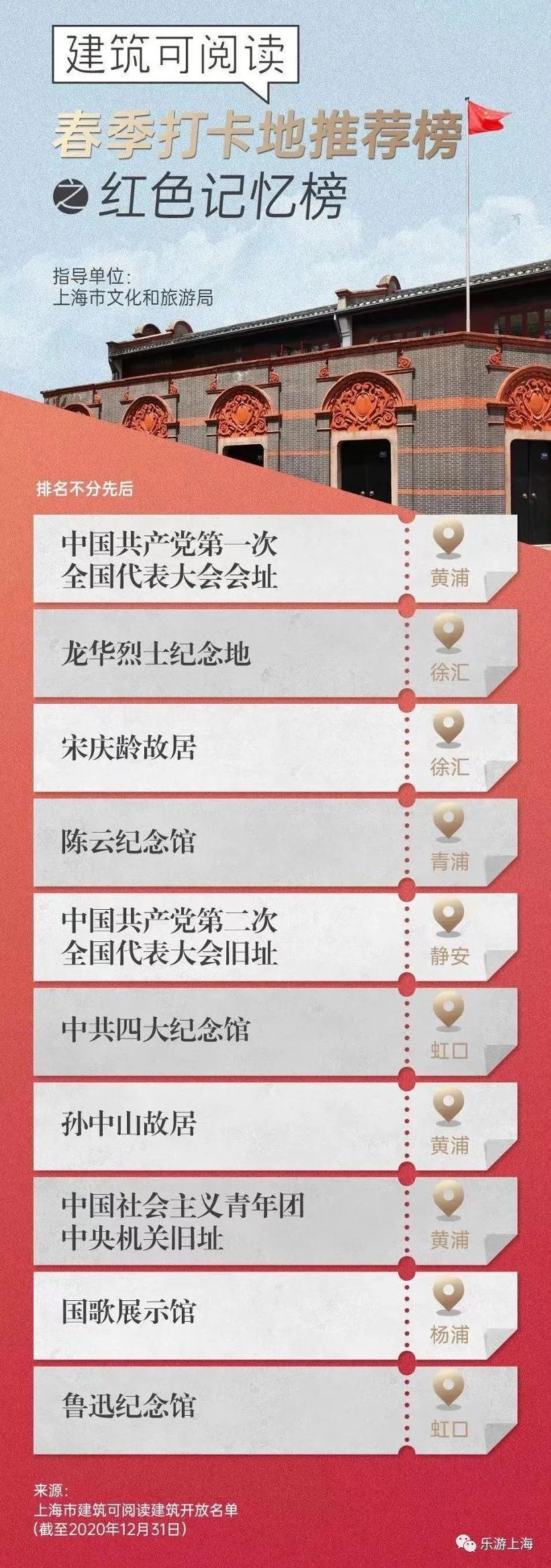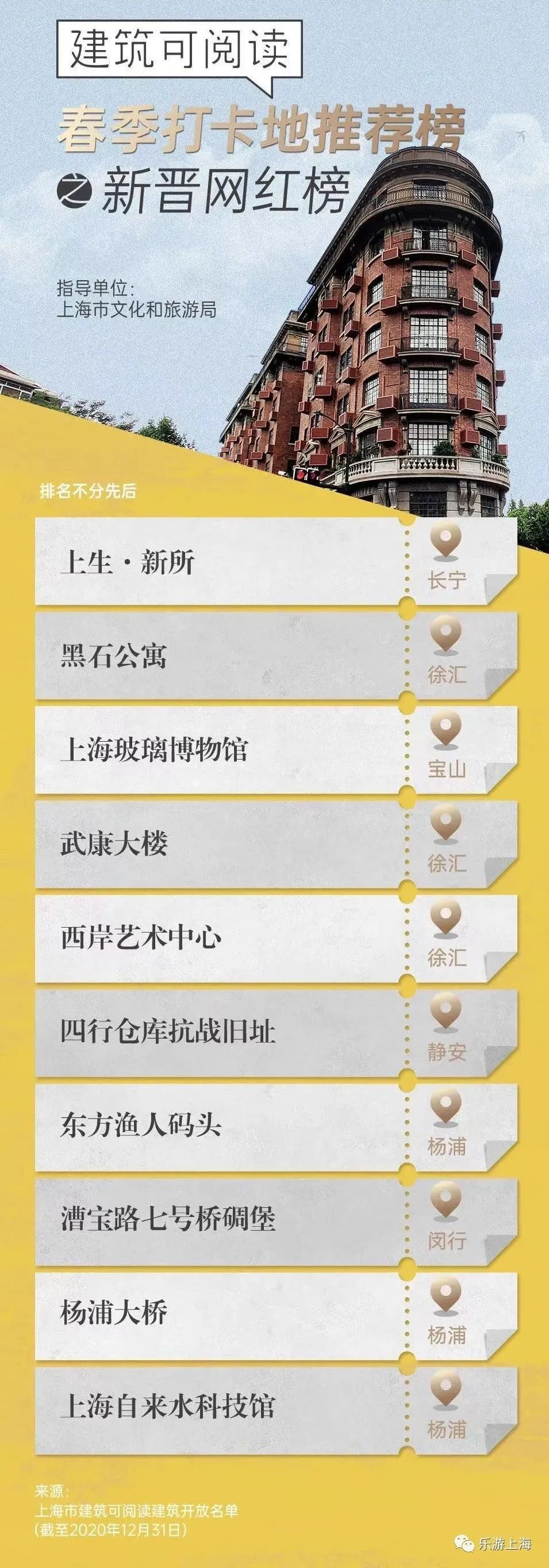 上海市文旅局发布了《2021年“建筑可阅读”春季打卡推荐榜单》,涵盖、新晋网红等6个榜单,包括鲁迅纪念馆、东方明珠塔、武康大楼等。2021年“建筑可阅读”十大行动计划也同日发布。详见下文↓↓