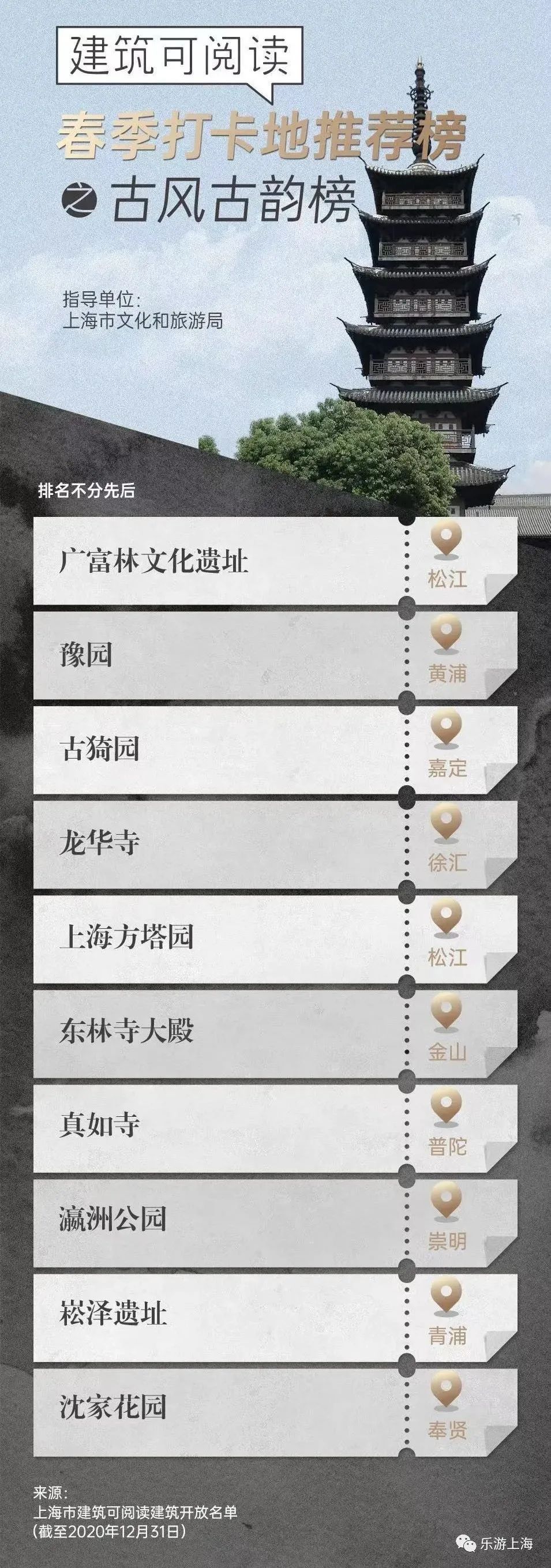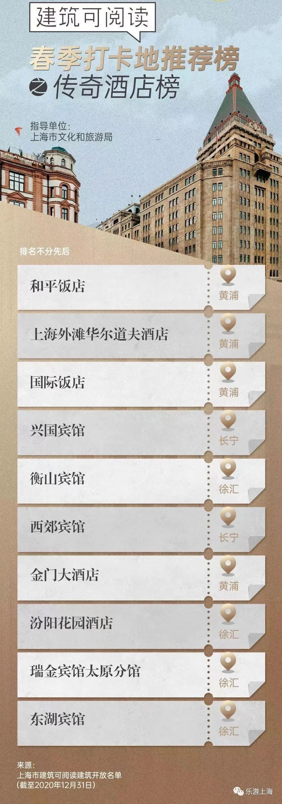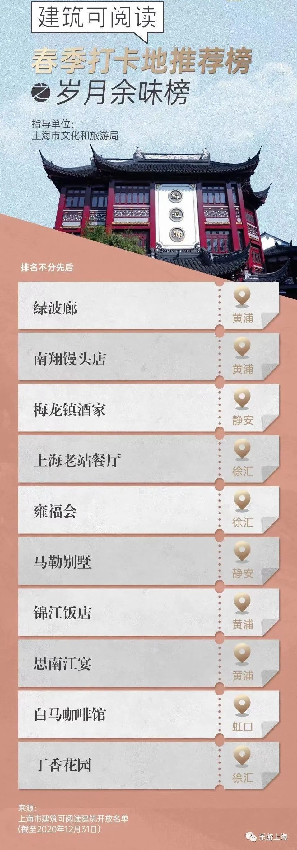 上海市文旅局发布了《2021年“建筑可阅读”春季打卡推荐榜单》,涵盖、新晋网红等6个榜单,包括鲁迅纪念馆、东方明珠塔、武康大楼等。2021年“建筑可阅读”十大行动计划也同日发布。详见下文↓↓