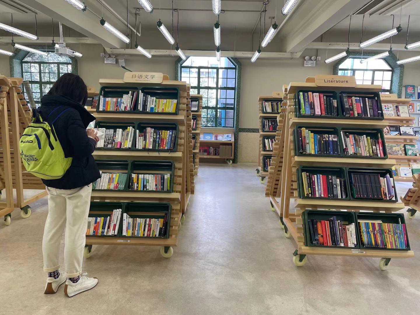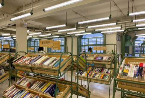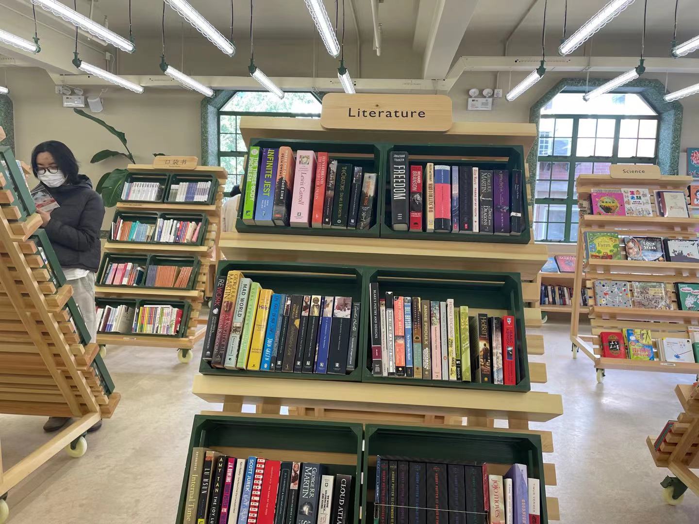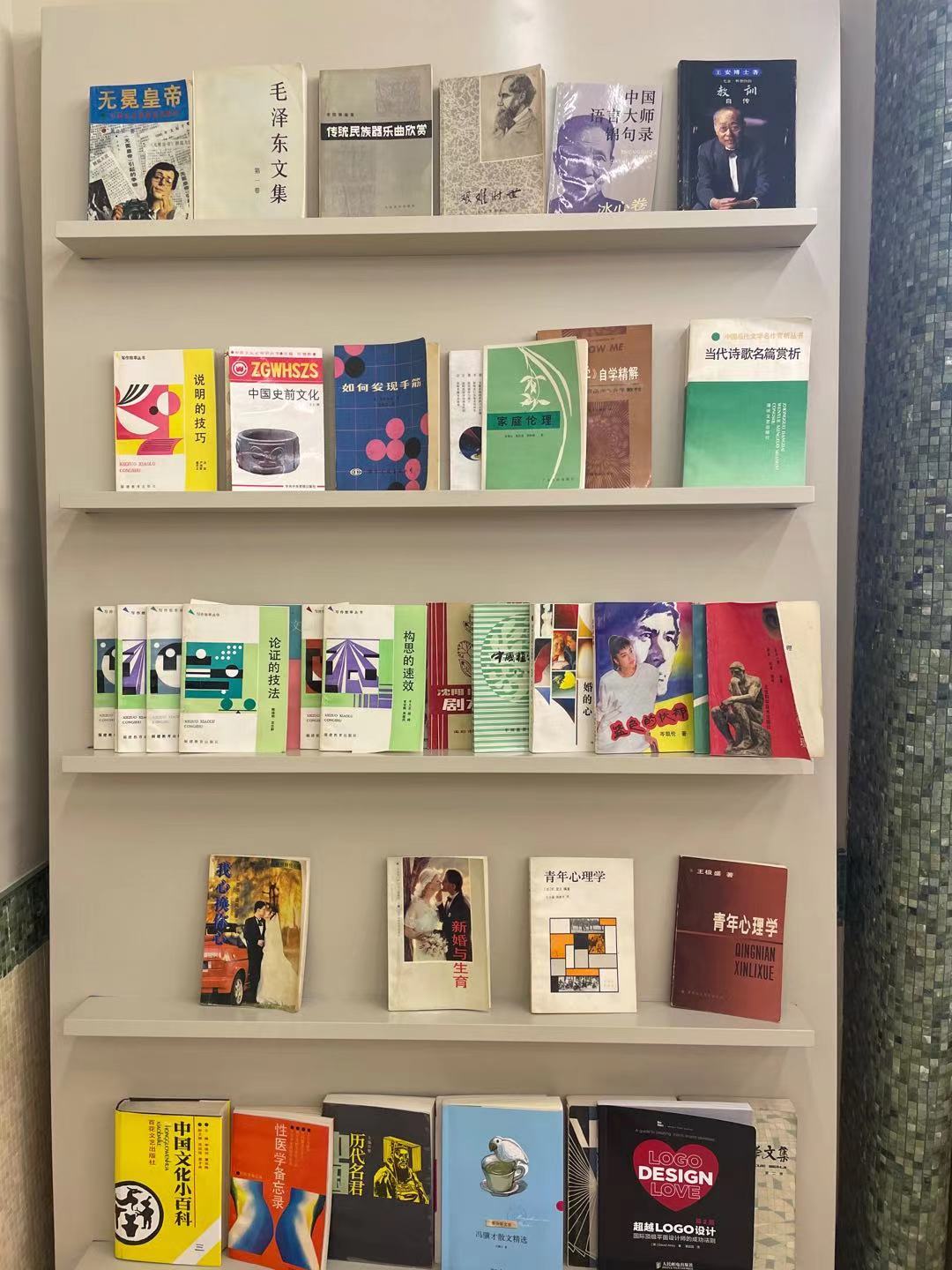 大大的铁艺书架是统一的淡绿色,这些从大家手中循环来的二手书都可自由翻阅,笔者翻了下,书的品相都不错,有一些书应该是做了热缩膜处理。有时候看到别人在二手书留下的笔记,有恍然踏入他人精神世界的感觉,很奇妙。书架之间的空隙比较大,方便走动。