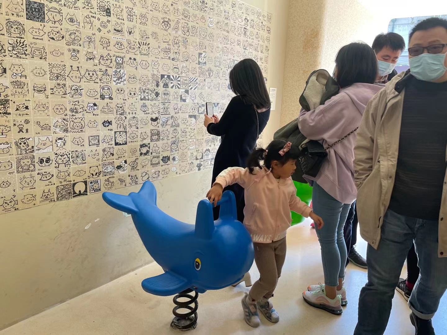 在入口处,有一面多抓鱼的表情墙,有很多人在拍照,墙壁前是两个小朋友玩的摇摇马坐骑。