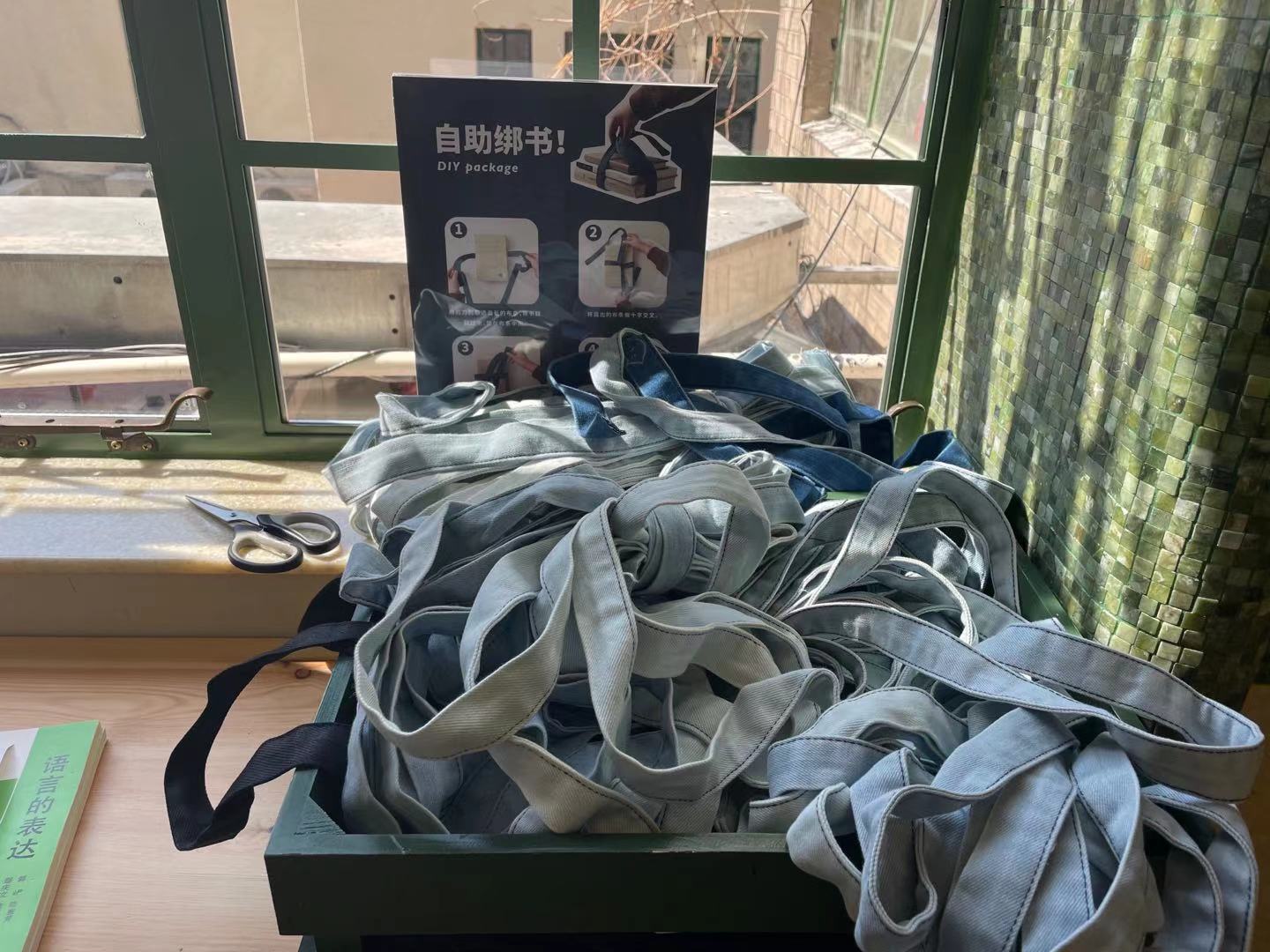 到收银台买单完后,发现旁边的台子上可以自助绑书,是用牛仔服的边角余料制作的绑带,旁边还放着剪刀,需要多长就可以剪多长,真的比较环保。笔者买书回来才发现绑带上也有多抓鱼的小图案,细节做得不错。