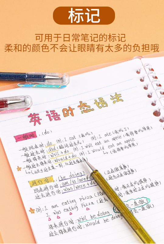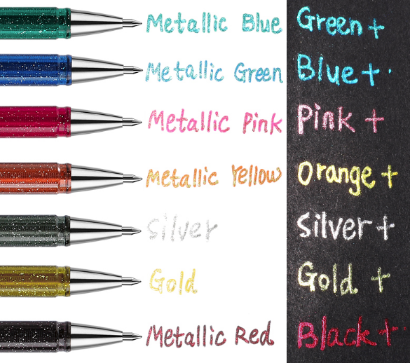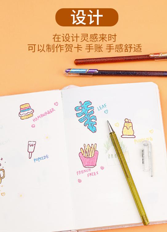 这种闪光笔在白纸和黑卡纸上呈现不同的书写颜色,写在纸上还会有金属感的亮粉,非常适合用来做笔记或是做涂鸦、卡片制作。