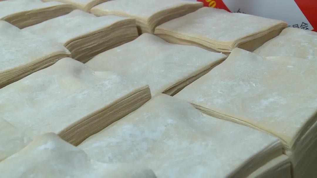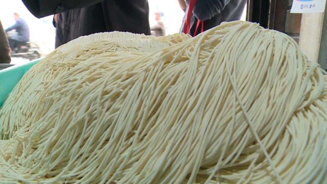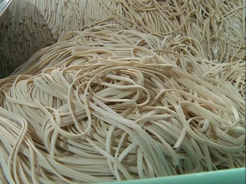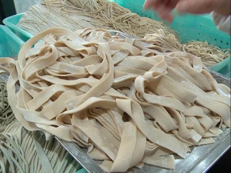 水和面粉没有确定比例,尺子都在做面的师傅心里,孙师傅说他用手捏一捏,就能知道面是偏软还是偏硬,每份面条都要经过机器擀压五六次,摸起来光滑才劲道。