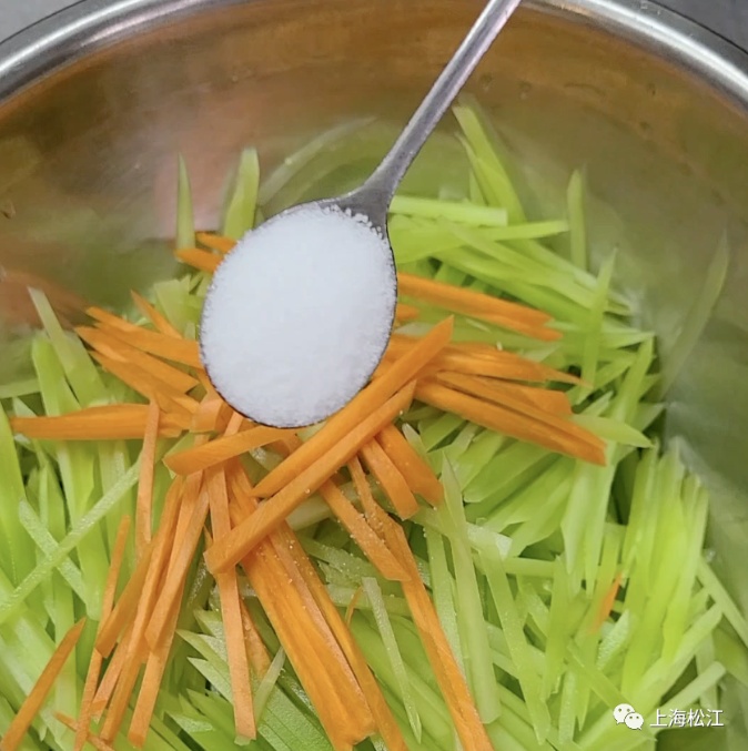 3. 莴笋丝500克,胡萝卜丝10克,加盐6克,捏去苦水,暴腌半小时;