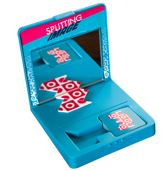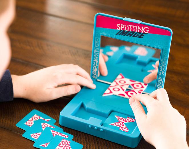 这个是根据镜面成像设计的一个桌游,我们小时候也拿镜子和纸笔画画玩过类似的游戏,不过这个更省心,两片几何块搭配一面镜子,就能玩出很多的花样。需要通过在镜子前摆放几何片,使镜子前的拼图片和镜子中的成像组合而成的图案,跟挑战卡上的一致。