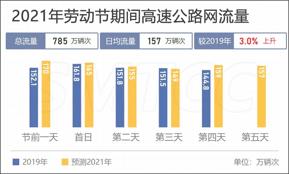 据市交通管理部门预测,今年劳动节5天假期,本市高速公路总流量将达到785万辆次,日均157万辆次,比2019年上升3%。